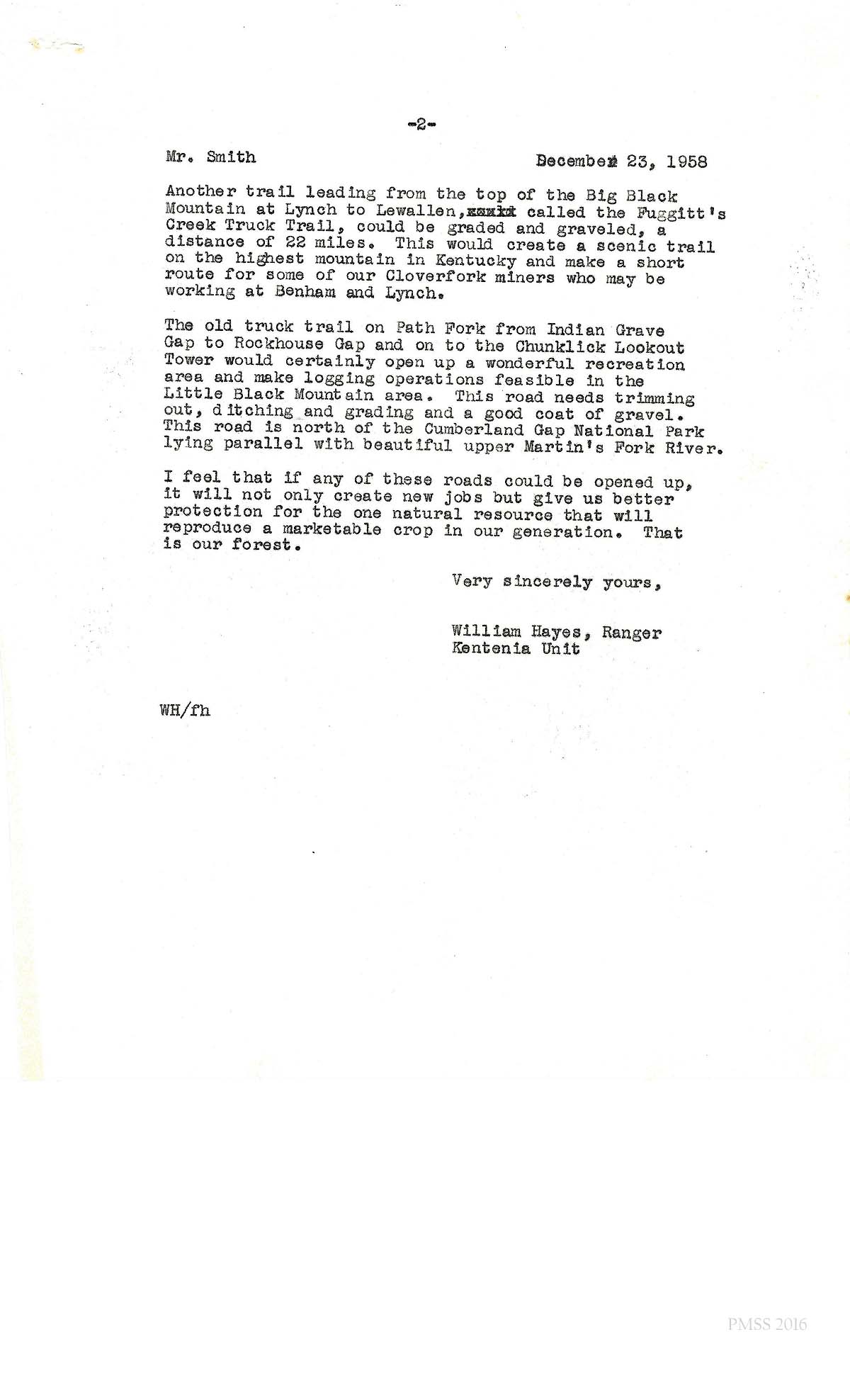 On December 23, 1958, William Hayes wrote a letter to Cam Smith, the County Judge for Harlan County, regarding road funding that was proposed for Harlan County. It was the beginning of a dialog that would result in the eventual construction and re-construction of a small road along the crest of Pine Mountain. This road was to later be named the Little Shepherd Trail, after John Fox Jr.’s popular novel, The Little Shepherd of Kingdom Come, that was set in the area.