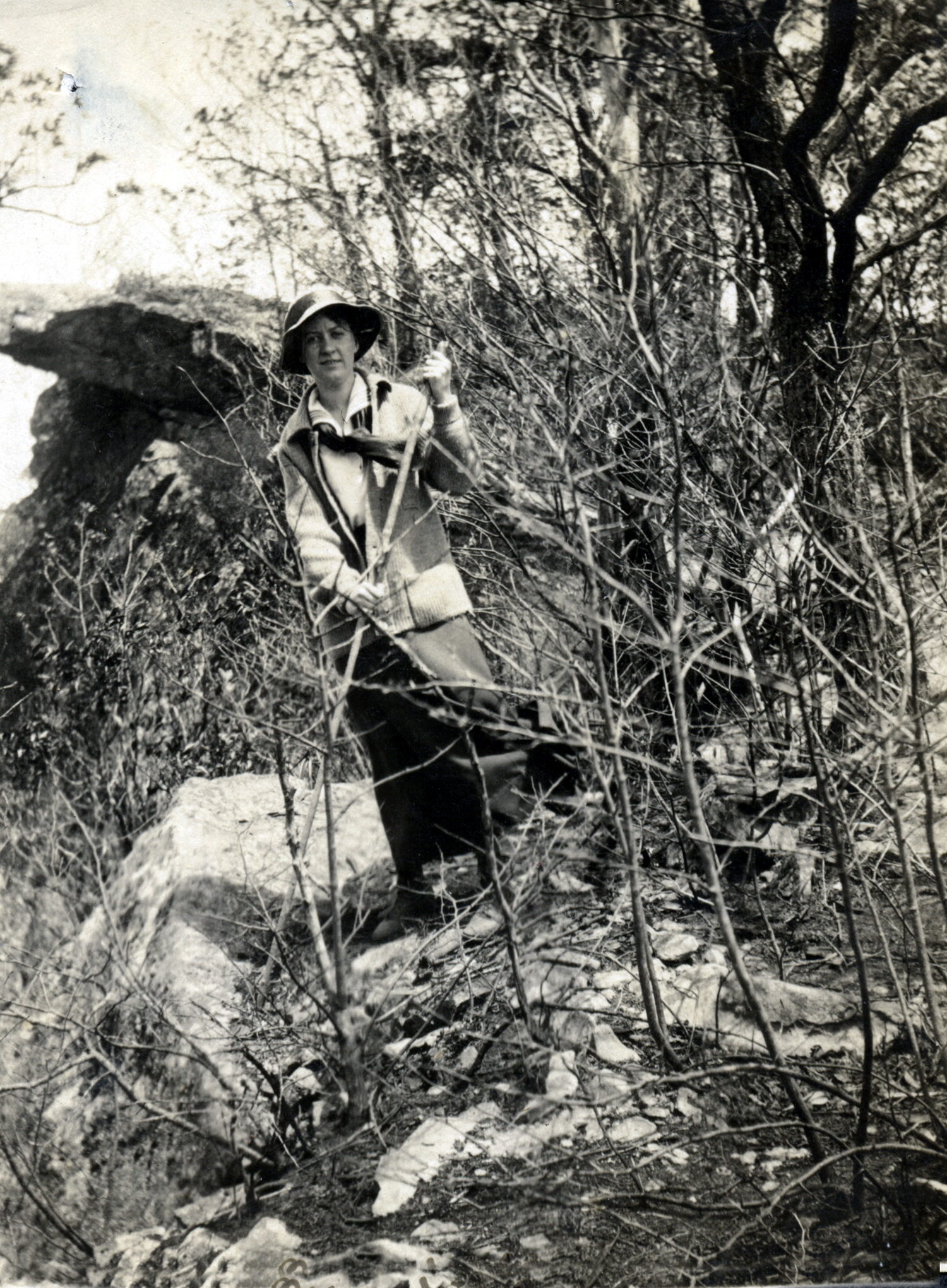 - Roettinger Album. “Ethel [McCullough] on Jack’s Gap” on Pine Mountain above the School. [Woman holding a walking stick with two hands.] [roe_054a.jpg]