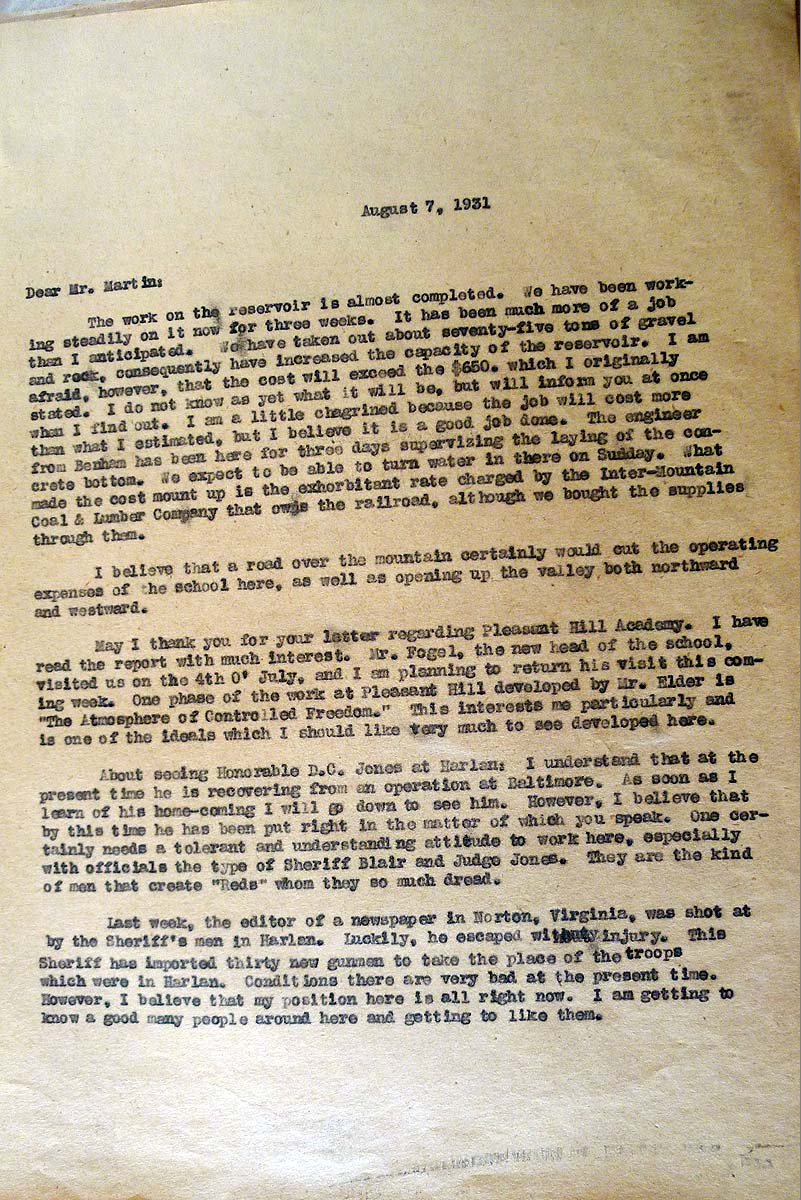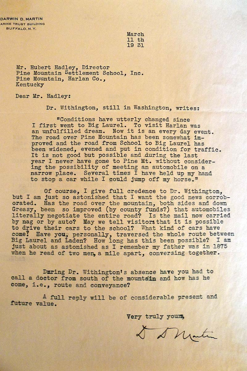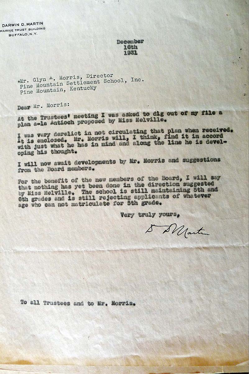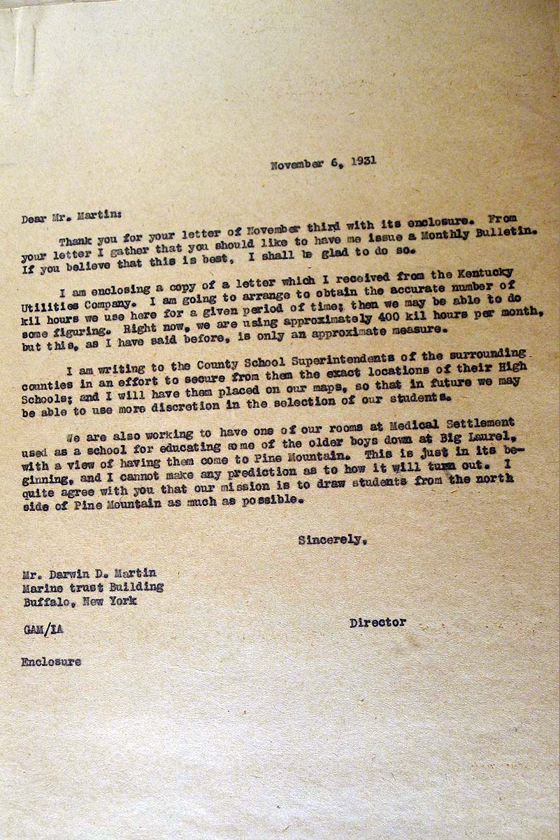 DARWIN D. MARTIN 1931 CORRESPONDENCE provides images and contents of 1931 letters to and from Darwin D. Martin, a member of the Board of Trustees at Pine Mountain Settlement School, 1920-1933, and a generous contributor to and consultant for the School. He was an executive of the Larkin Co. in Buffalo, New York.