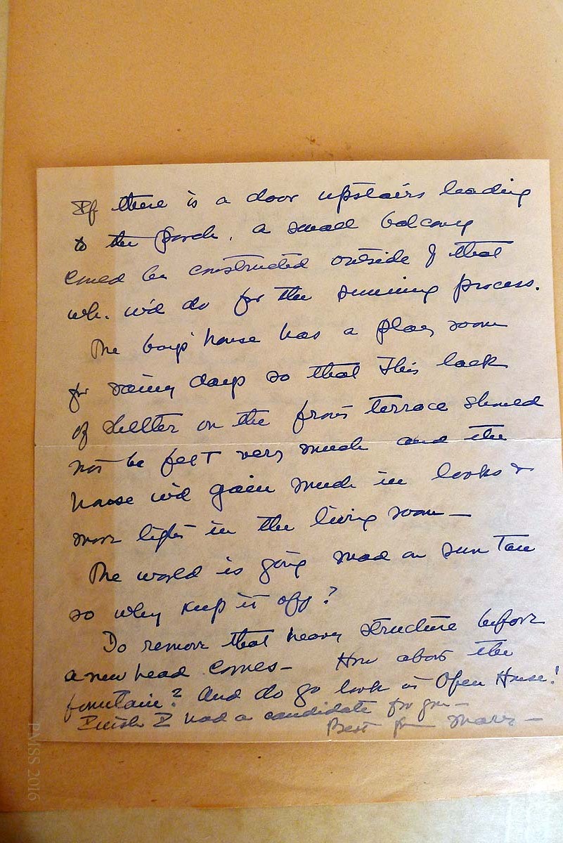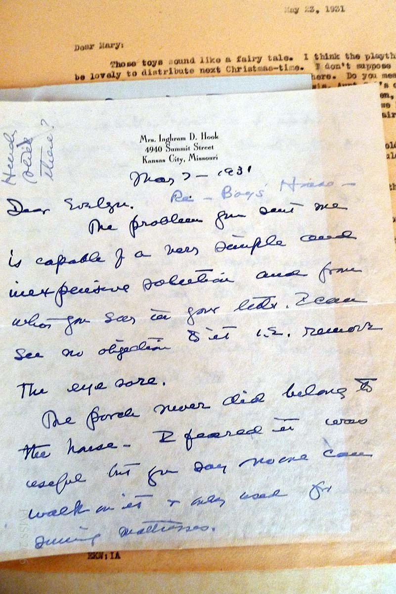 [P1050708 & P1050709] March 7, 1931. Handwritten letter to Evelyn Wells from Mrs. Inghram D. (Mary Rockwell) Hook, Kansas City, MO. Pages 1 & 2. Regarding Boy’s House [upper] porch: “…The porch never did belong to the house…remove the eye sore….” Hook suggests a small balcony instead.