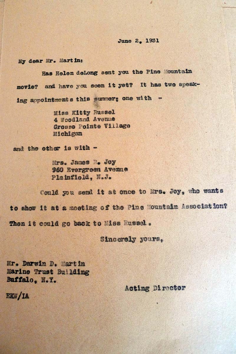 [P1050712] June 2, 1931. Carbon copy of letter to Mr. Martin in Buffalo, NY, from Evelyn K. Wells, PMSS Acting Director. Wells asks whether Helen de Long sent Martin the Pine Mountain movie. “It has two speaking appointments this summer,” with Miss Kitty Russel of Grosse Pointe Village, MI, and Mrs. James R. Joy of Plainfield, NJ. Russel wants to show it at a Pine Mountain Assn. meeting.