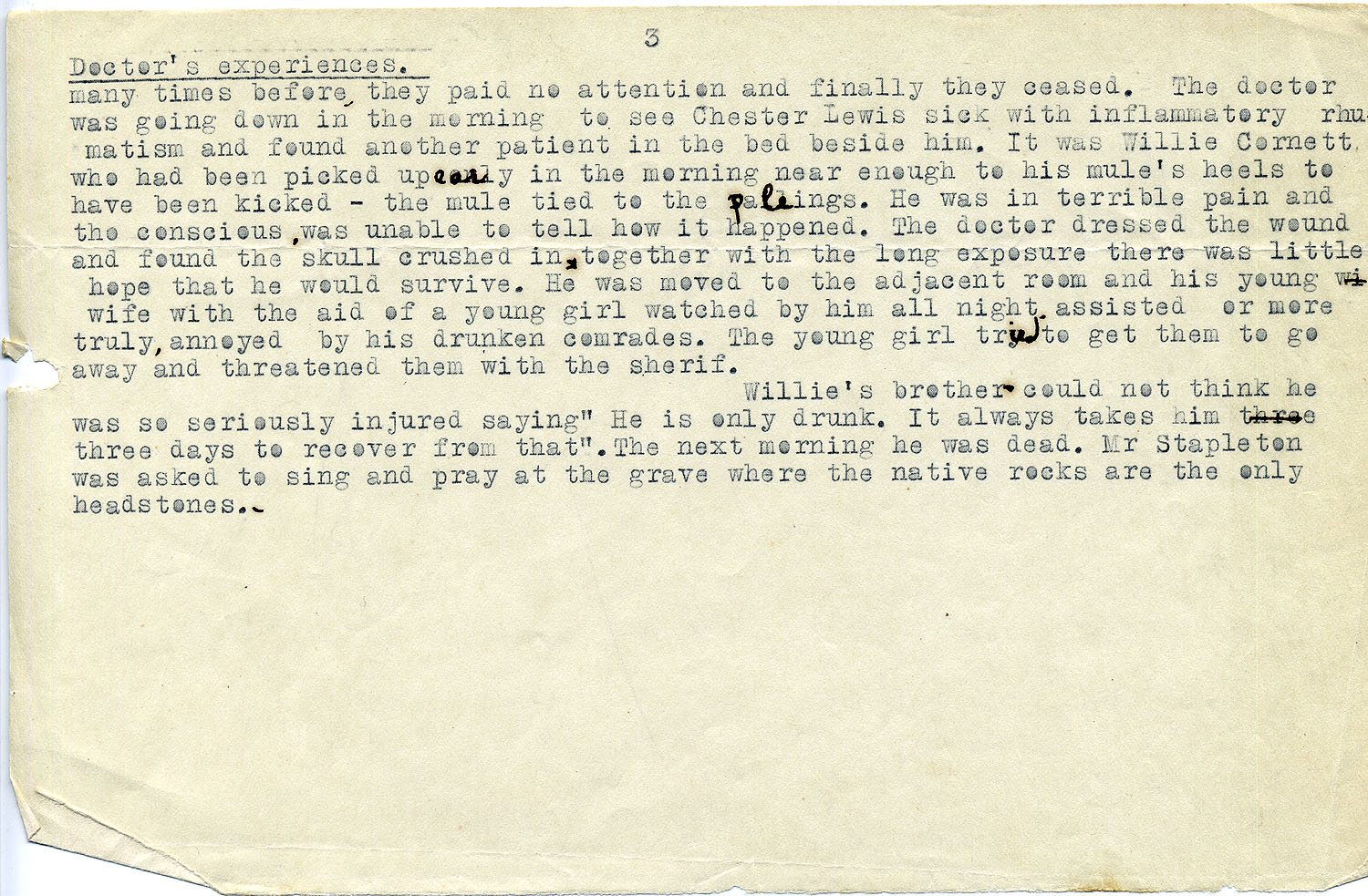 Willie Cornett was a loving young husband and father to two little boys and a baby girl. He had just finished a nice board cabin with windows and sealed walls. But he had a terrible thirst for moonshine. Even when his little daughter lay dead he went off for the drink. A few weeks later he went off again for drink and the doctor met his wife as she was on her way to persuade him to return home on Sunday afternoon. For the time she succeeded, but early in the evening he was mastered again by the thirst for more and in spite of his wife’s pleadings he went off. About eight o’clock the Henry Lewises heard shoutings up on the high road but having heard them many times before, they paid no attention and finally they ceased. The doctor was going down in the morning to see Chester Lewis sick with inflammatory rheumatism and found another patient on the bed beside him. It was Willie Cornett who had been picked up early in the morning near enough to his mule’s heels to have been kicked – the mule tied to the palings. He was in terrible pain and tho conscious, was unable to tell how it happened. The doctor dressed the wound and found the skull crushed in; together with the long exposure there was little hope that he would survive. He was moved to the adjacent room and his young wife with the aid of a young girl watched by him all night, assisted or more truly, annoyed by his drunken comrades. The young girl tried to get them to go away and threatened them with the sheriff.