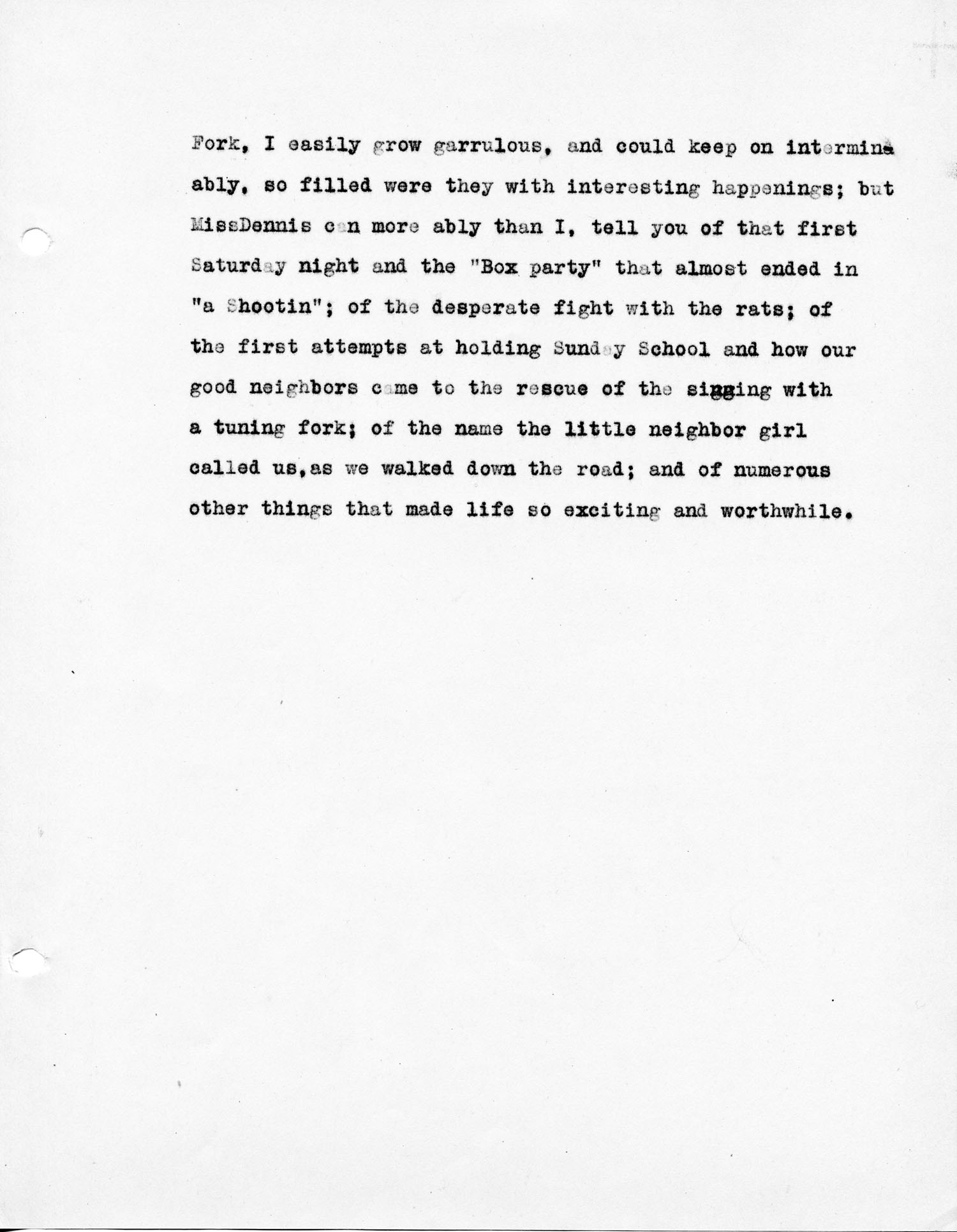 Her reasons for leaving are not clear. Four weeks is hardly enough time to begin to make connections with the Line Fork culture, but consistent with the brief time of most of the early teachers. The children had only a small window in which to attend school, as the crops required the whole family. Consequently, work in the fields took precedence over work in the classroom for most families. This may be why her selection of the single incident of the “aeroplane” at Line Fork as her narrative focus is of consequence. It suggests she had little time to make memorable personal connections and only a few incidents find their way into her account. She defers to Ruth Dennis to fill in the cultural gaps and her narrative concludes after only about two and a half pages.