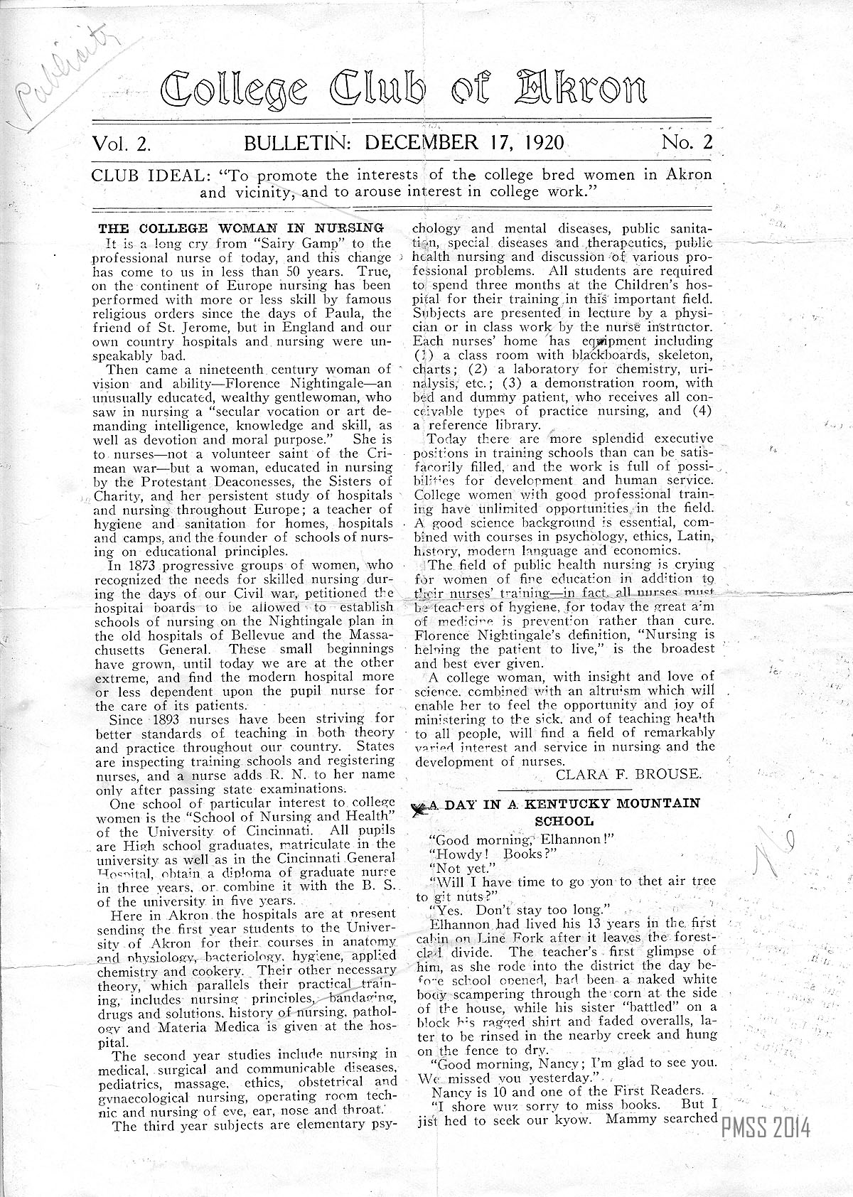 In this article by Emily C. Harpham, who worked at Line Fork for six weeks during September and October for Pine Mountain Settlement School’s extension services, writes of her experiences. Her article appeared in the December 17, 1920, College Club of Akron Bulletin, a club that seeks to “Promote the interests of the college bred women in Akron and vicinity, and to arouse interest in college work.”