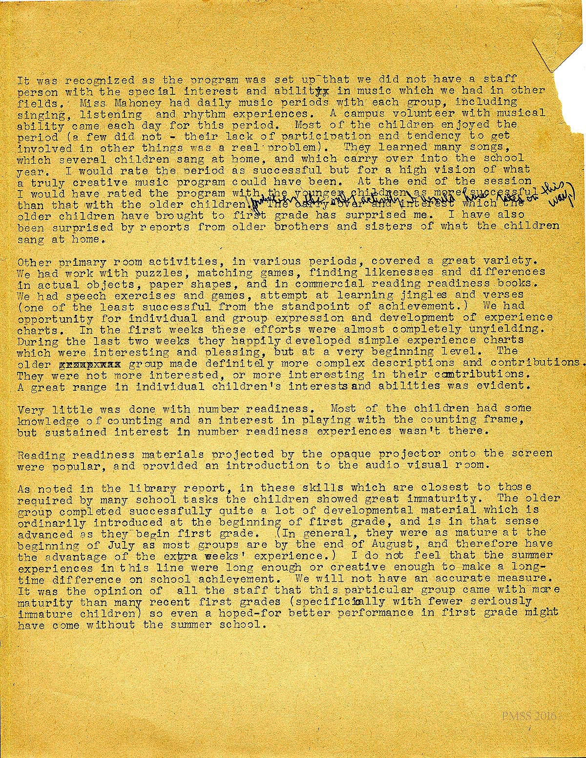 Mahoney continues description of activities in each class and the students’ varied degrees of compliance. “Very little was done with number readiness.” Reading readiness materials projected by the opaque projector…were popular and provided an introduction to the audio visual room.” Describes the varying levels of maturity in the students. “I do not feel that the summer experiences in this line were long enough or creative enough to make a long-tome difference on school achievement.”