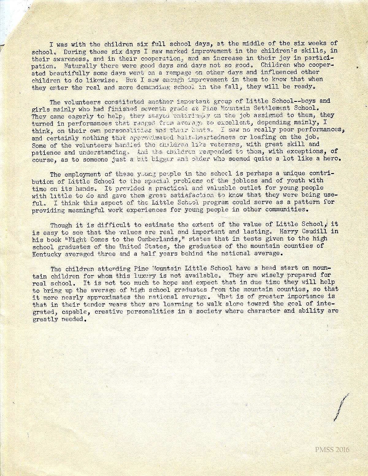 “It was my judgment that, over-all, this was the best of our three summer sessions … I also heard that our community reputation got a boost from Ruth Lewis, who visited Little School before she opened her Head Start project.” Lewis trained at Eastern Kentucky University and visited their pre-school group, concluding that PMSS’s kindergarten was “so far ahead of Eastern’s ….”