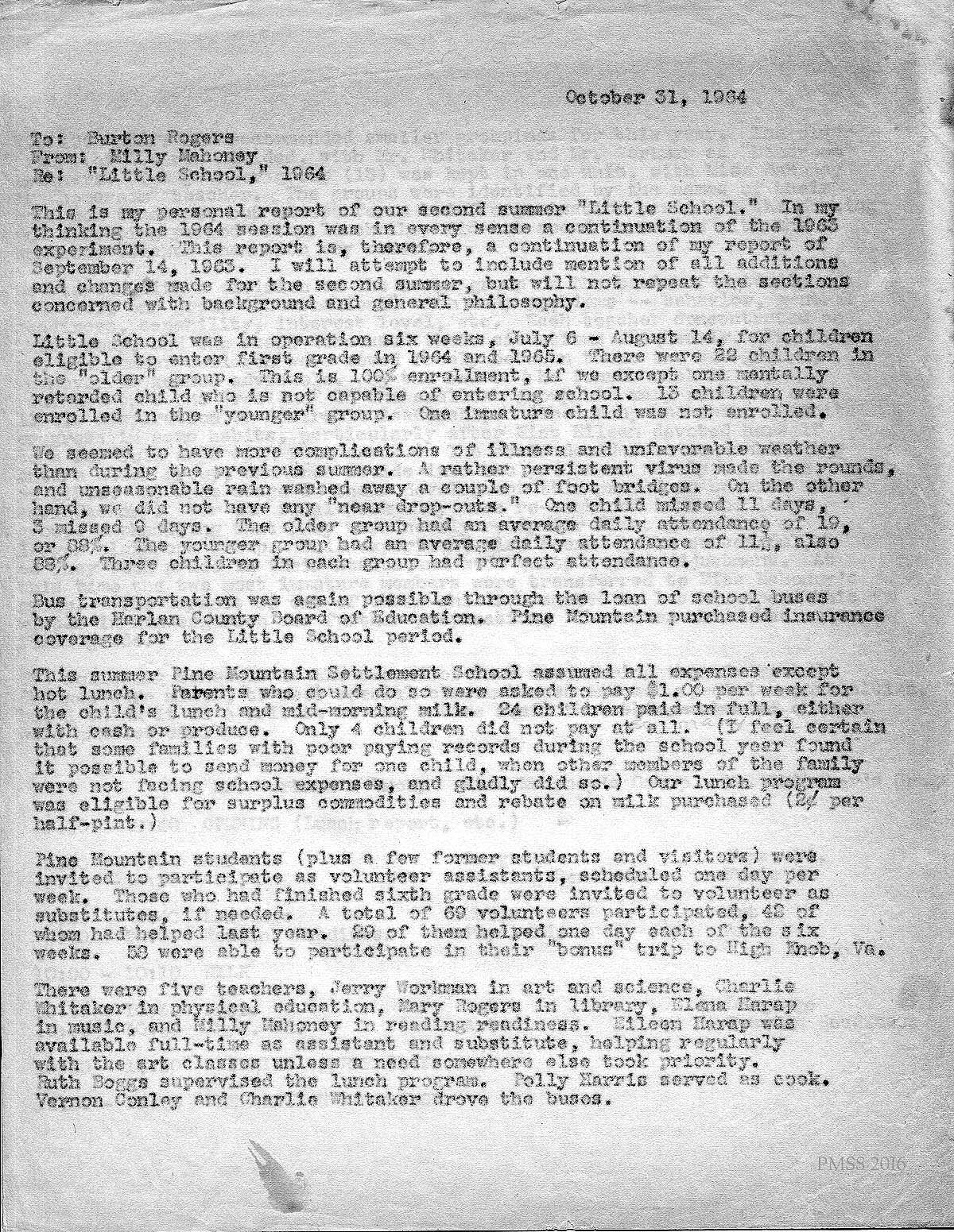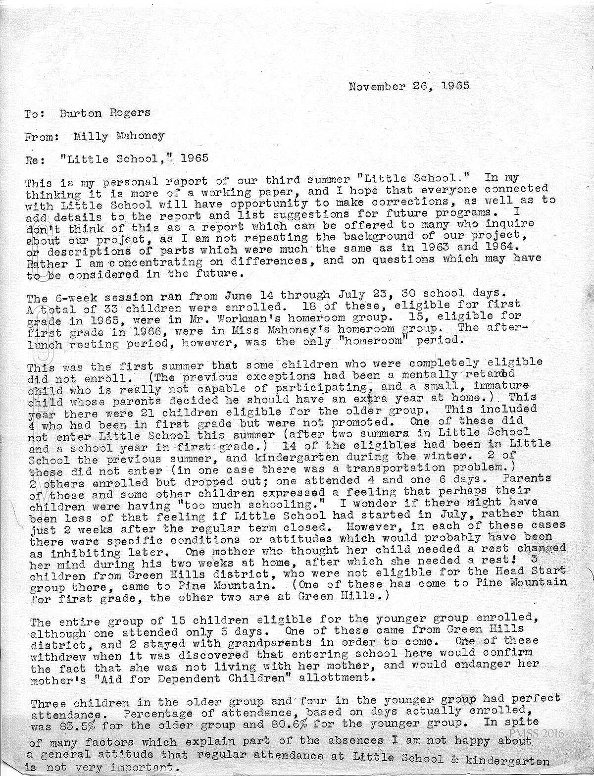 - 1964-1965 Report to Burton Rogers on Little School. [1964-65_mahoney_rpt_001.jpg]