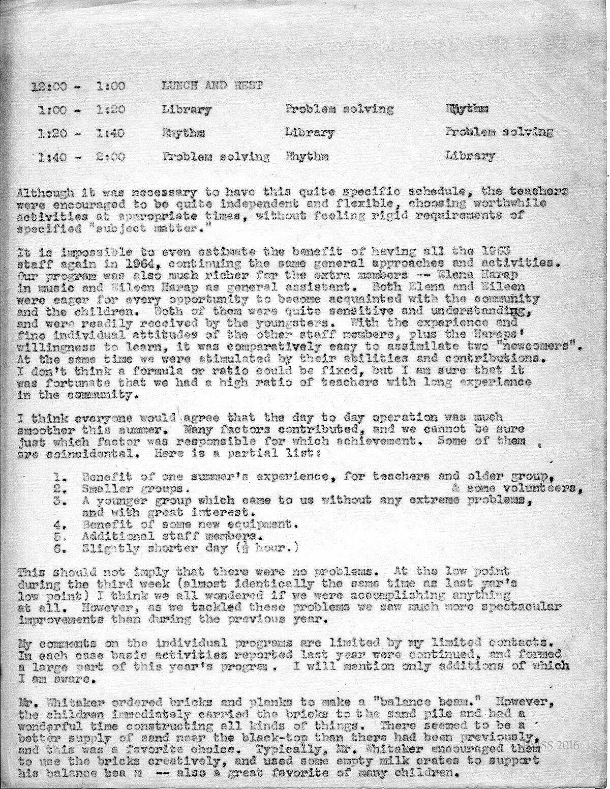 Mahoney describes “the benefit of having all the 1963 staff again in 1964, continuing the same general approaches and activities” and having the extra support of the Haraps. She praises the Haraps for their work with the children and their assimilation with the other teachers; appreciates the high ratio of teachers with long experience in the community. She lists the factors that contributed to smoother day-to-day operations, describes problems that were encountered (but saw increased improvements compared to last year) and lists additions to this year’s program.