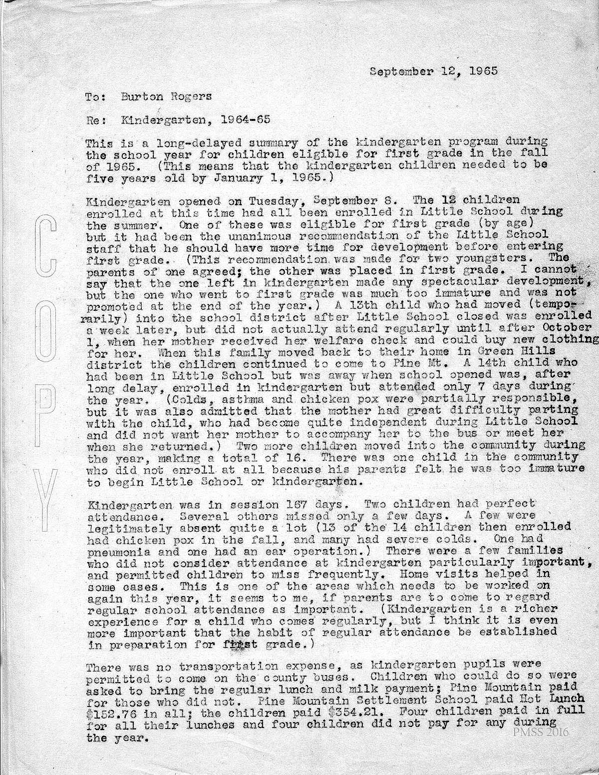 To [PMSS Director] Burton Roger from [unsigned, likely Mahoney], a “summary of the kindergarten program during the school year for children eligible for first grade in the fall of 1965.” Opening on September 8, 1964, 12 of the 16 children who enrolled had been in the summer Little School. Mahoney lists the reasons for absent students and feels that some parents need to understand that regular school attendance is important. Students used county buses and paid for their lunch and milk if possible. She compares the hot lunch expenses paid by PMSS and students.