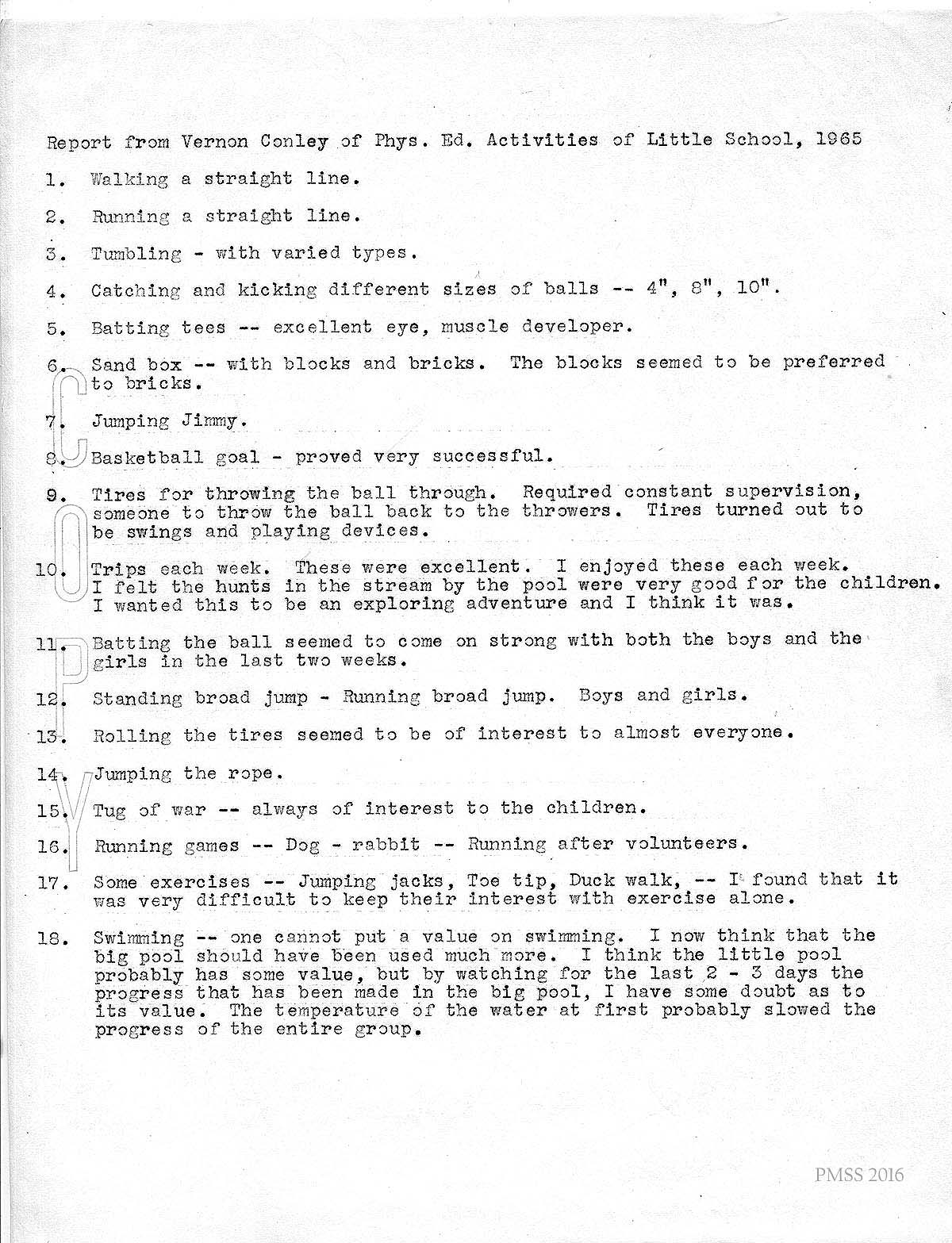 “Report from Vernon Conley of Phys. Ed. Activities of Little School, 1965,” lists 18 different children’s activities that occur in his class and his comments concerning them.