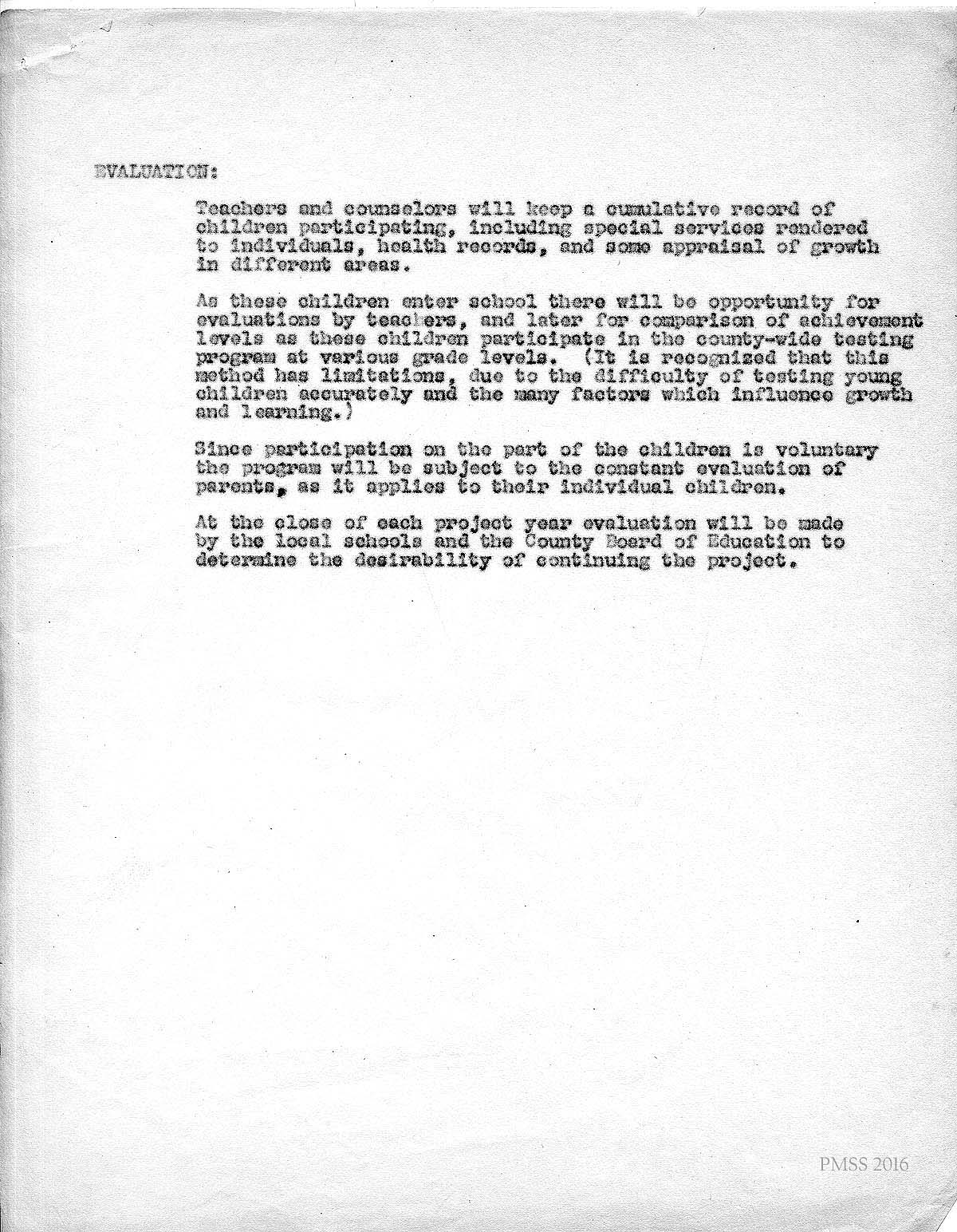 Evaluation: “Teachers and counselors will keep a cumulative record of children participating, including special services …, health records and some appraisal of growth …” There will be evaluations as the children enter school, evaluation of parents and annual evalutations by local schools and the County Board of Education “to determine the desirability of continuing the project.”