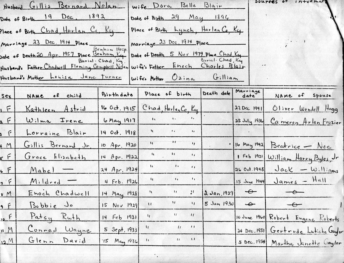18. Genealogy chart for Gillis Bernard Nolan (1892-1957; son of C.F.C. Nolan) and his spouse, Dora Belle Blair (1896-1979) and their children.