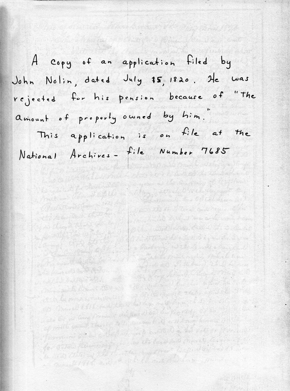 06, page 2. Handwritten note concerning John Nolan’s application for his pension on July 15, 1820, and subsequent rejection.