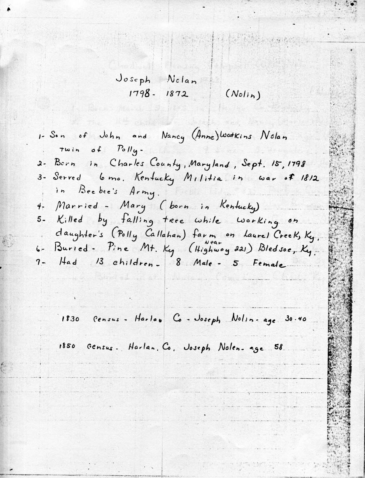 11. Handwritten list of life events for Joseph Nolan (1798-1872).