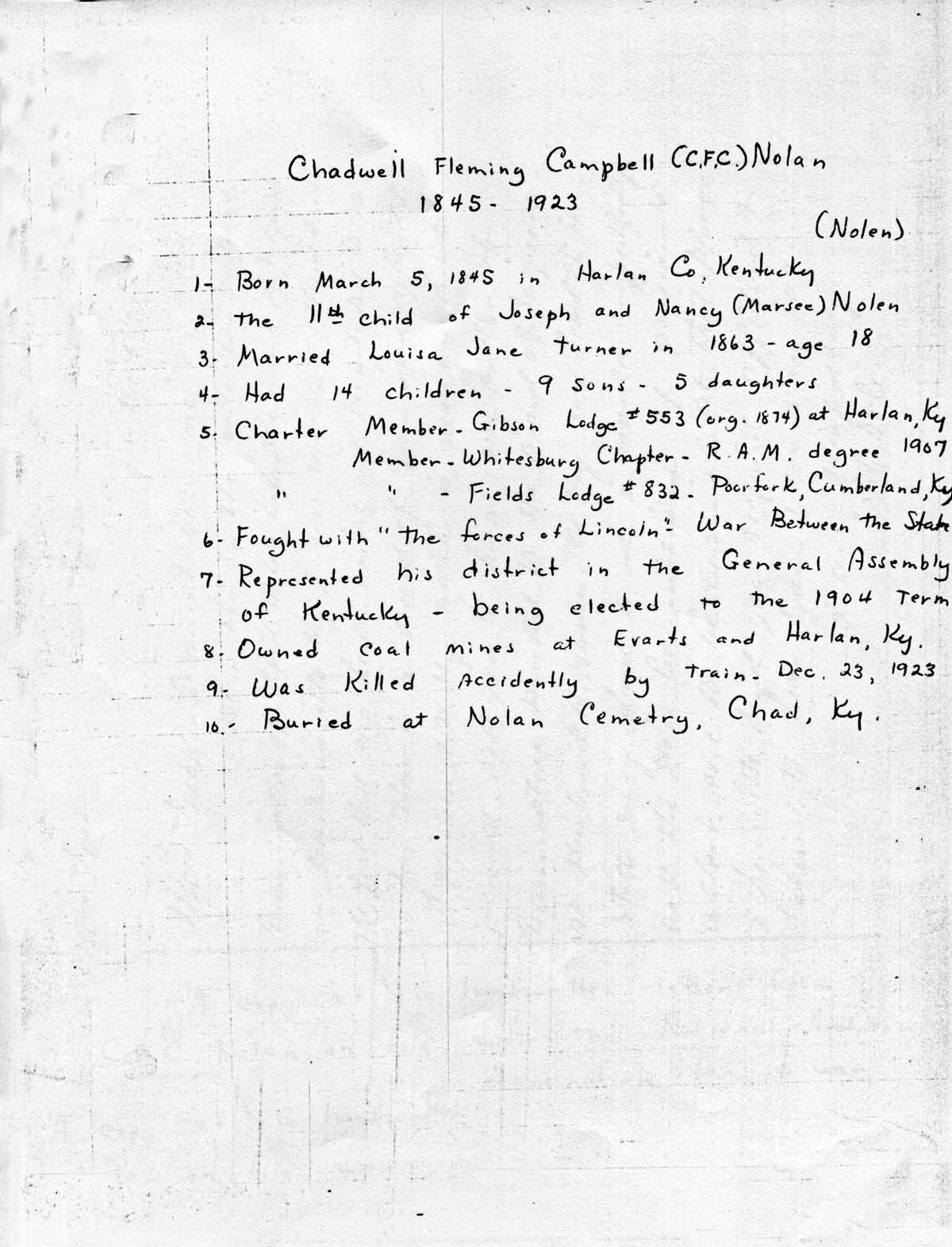 12. Handwritten list of life events for Chadwell Fleming Campbell (C.F.C.) Nolan, 1845-1923.