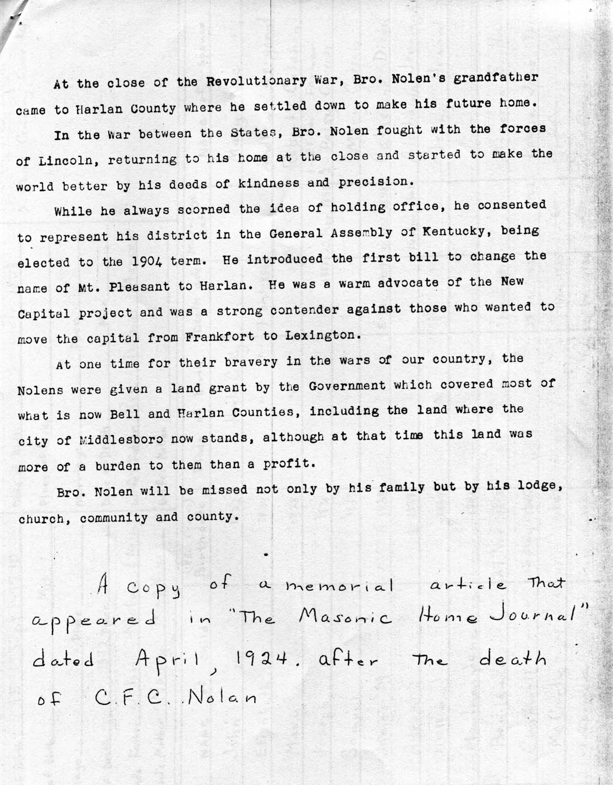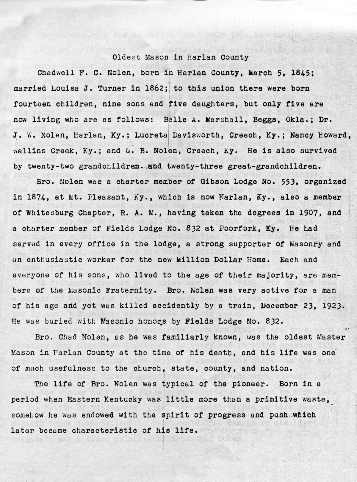13, page 1. Typewritten narrative titled “Oldest Mason in Harlan County,” Chadwell F.C. Nolen [sic], (1845-1923); describes his family, life, military service, contributions to his community and his history with the Masonic Fraternity.