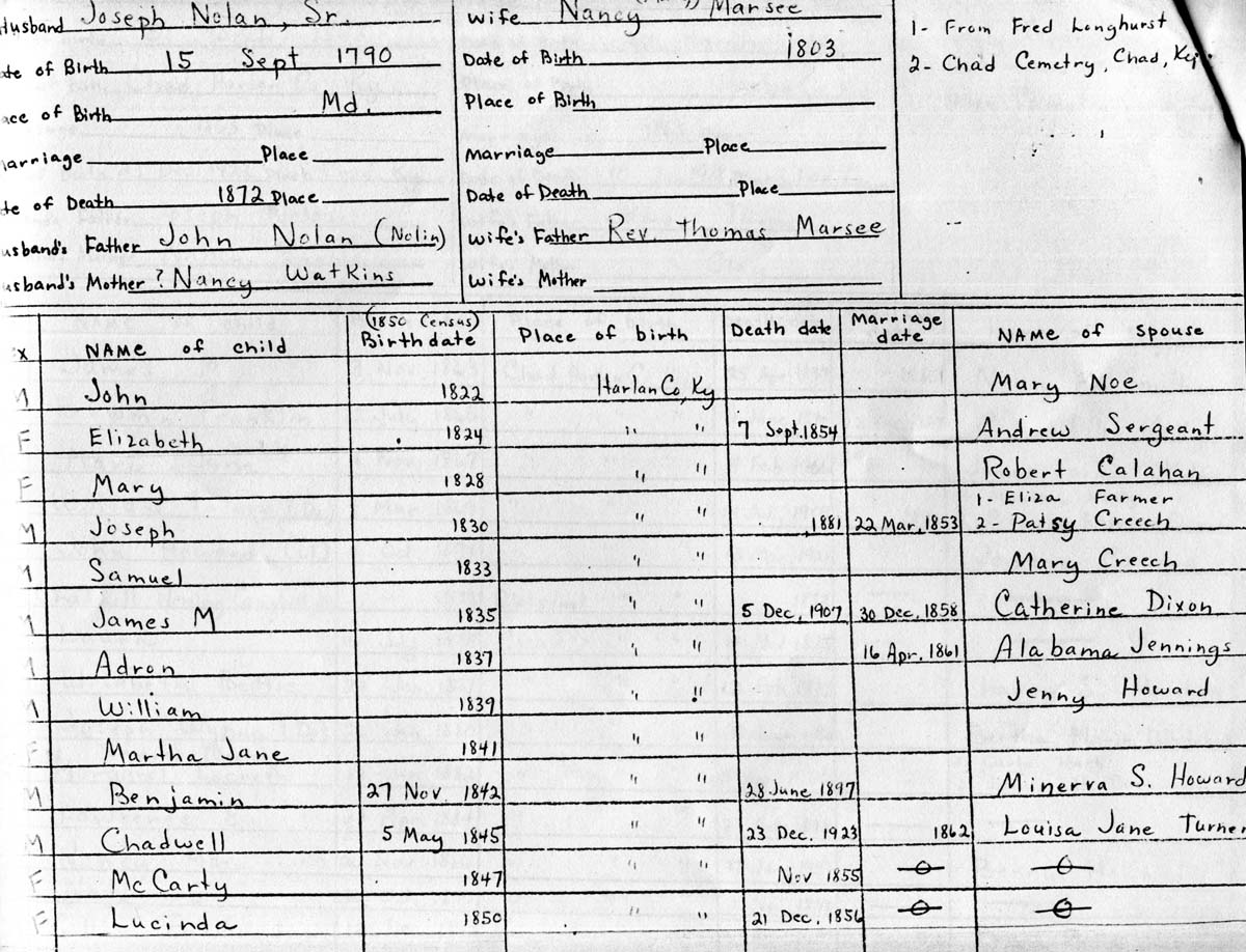 16. Genealogy chart for Joseph Nolan, Sr. (1790-1872) and spouse Nancy Marsee (1803-?) and their children.