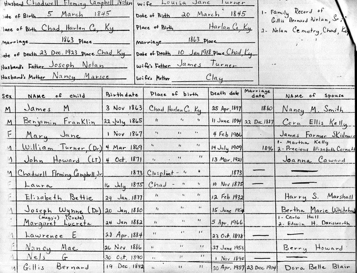 17. Genealogy chart for Chadwell Fleming Campbell Nolan (1845-1923; son of Joseph Nolan, Sr.) and spouse Louisa Jane Turner (1845-1918) and their children.