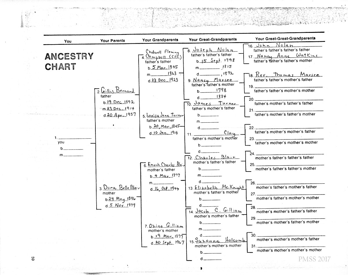 04. Ancestry Chart beginning with great-great-grandparents, John Nolan. Nancy Anne Watkins, and Rev. Thomas Marsee; ending with father, Gillis Bernard, and mother, Dora Belle Blair.