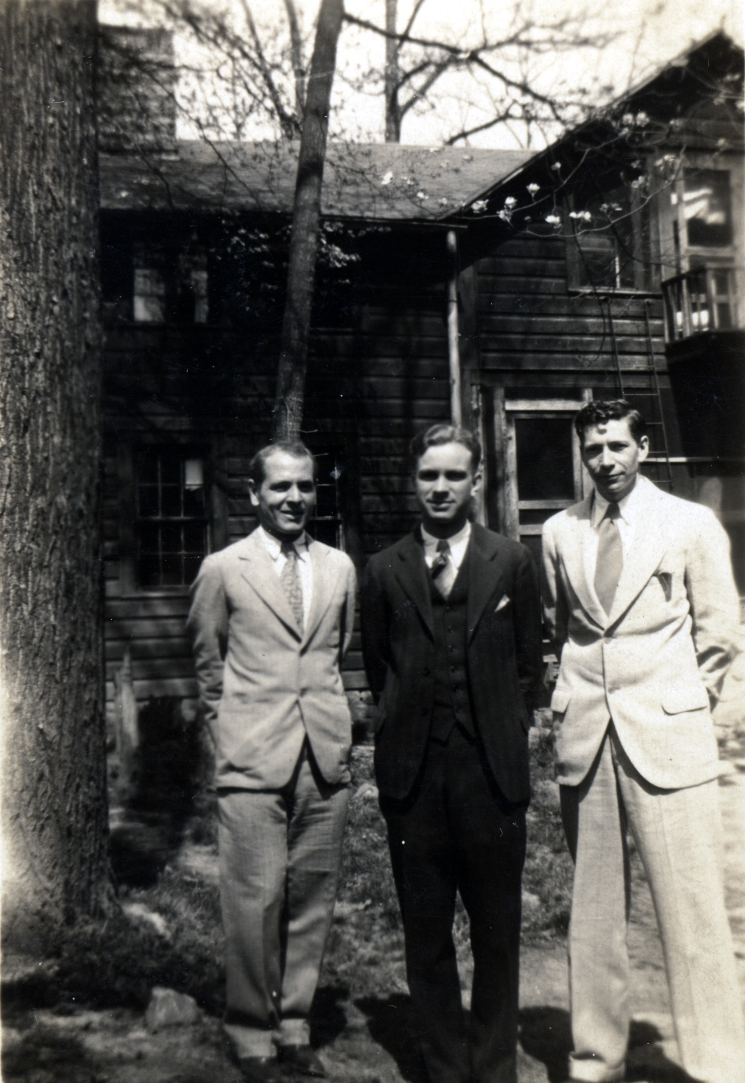 Three men from Antioch, 1930. Mr. John Howard Young, Mr. Argetsinger, Mr. Gough standing behind Farm House. [X_100_workers_2577_mod.jpg]