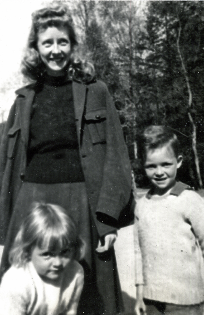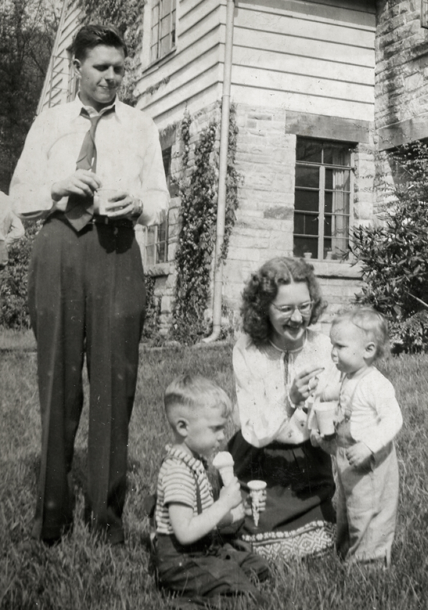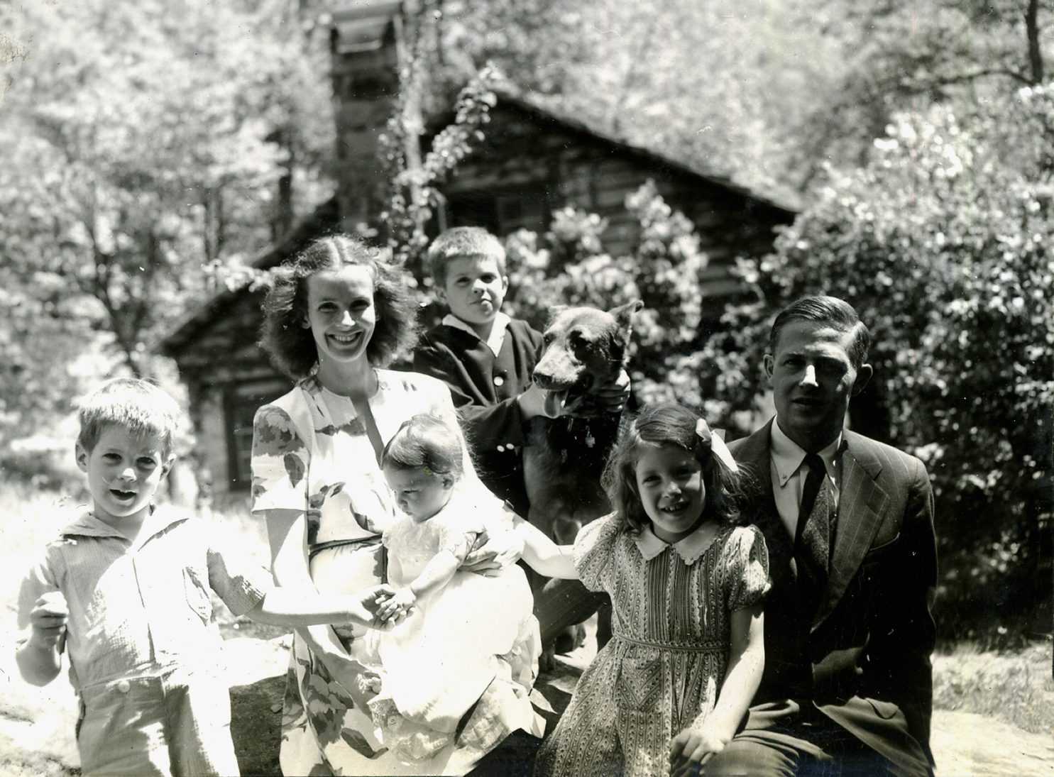 - Elizabeth Dodd, David, Roxana, and Kathy Barry in Old Log, 1947. [nace_1_041a.jpg]