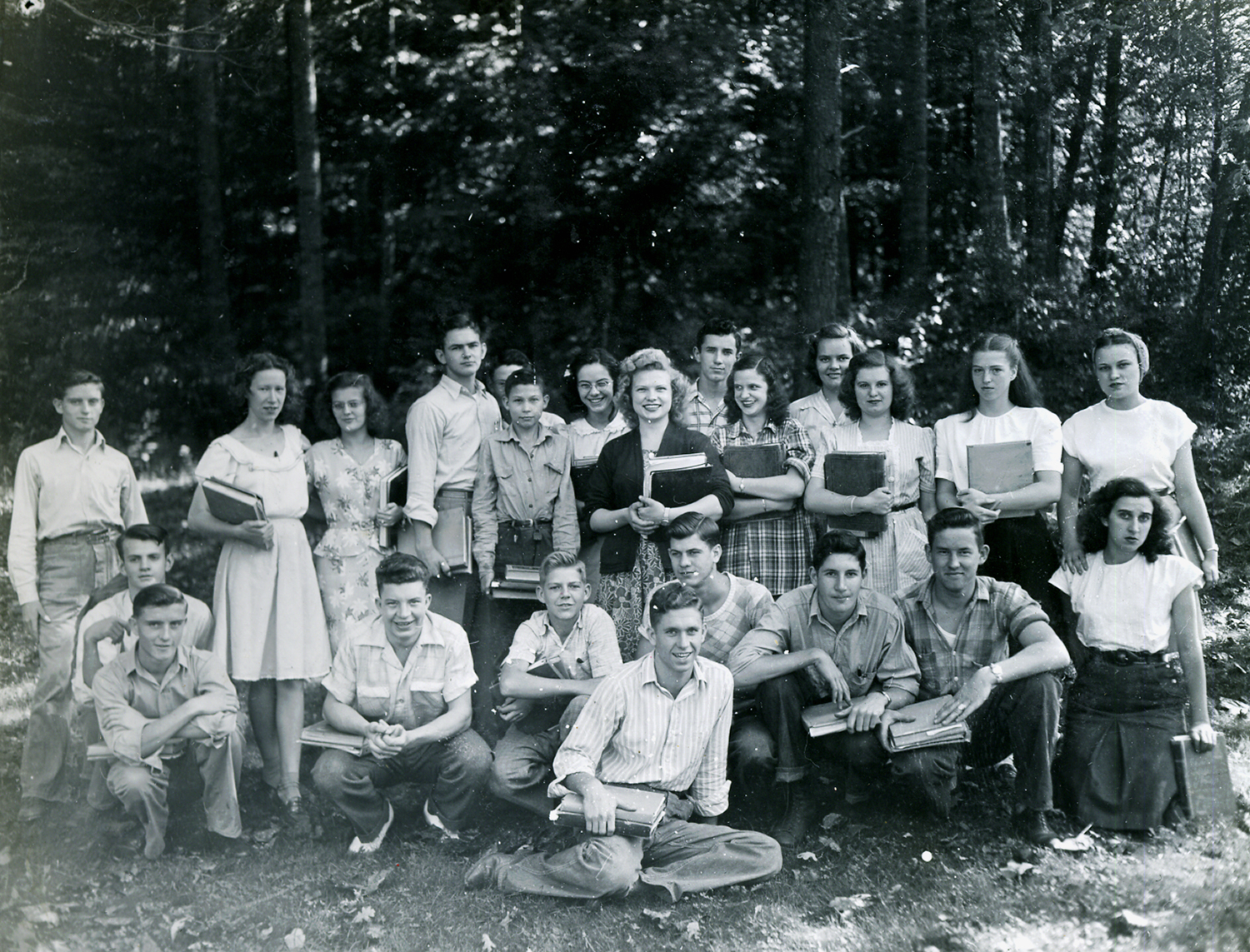 - Freshman Class, 1945-1946. Margaret Slusher, Frances Selvey, Naomi King, Birdie Miniard, Reba Blevins, Geraldine King, Bess Taylor, Eli Ison. Second Row: Fannie Mae Caldwell, Margie Belcher, Ora Mae Boggs, Donald Freemen, Carlos Banks, Leone Sturgill, Emmit Patterson, Bonnie Reynolds, Arnie Halcomb, Miller Howard. Back row: Ralph Scott, Earl Brown, Walter Blackson, Clayton Sturgill, Clarence Garrett, Harold Caudill, Arles Centers, Ray Bird. [nace_1_044b.jpg]