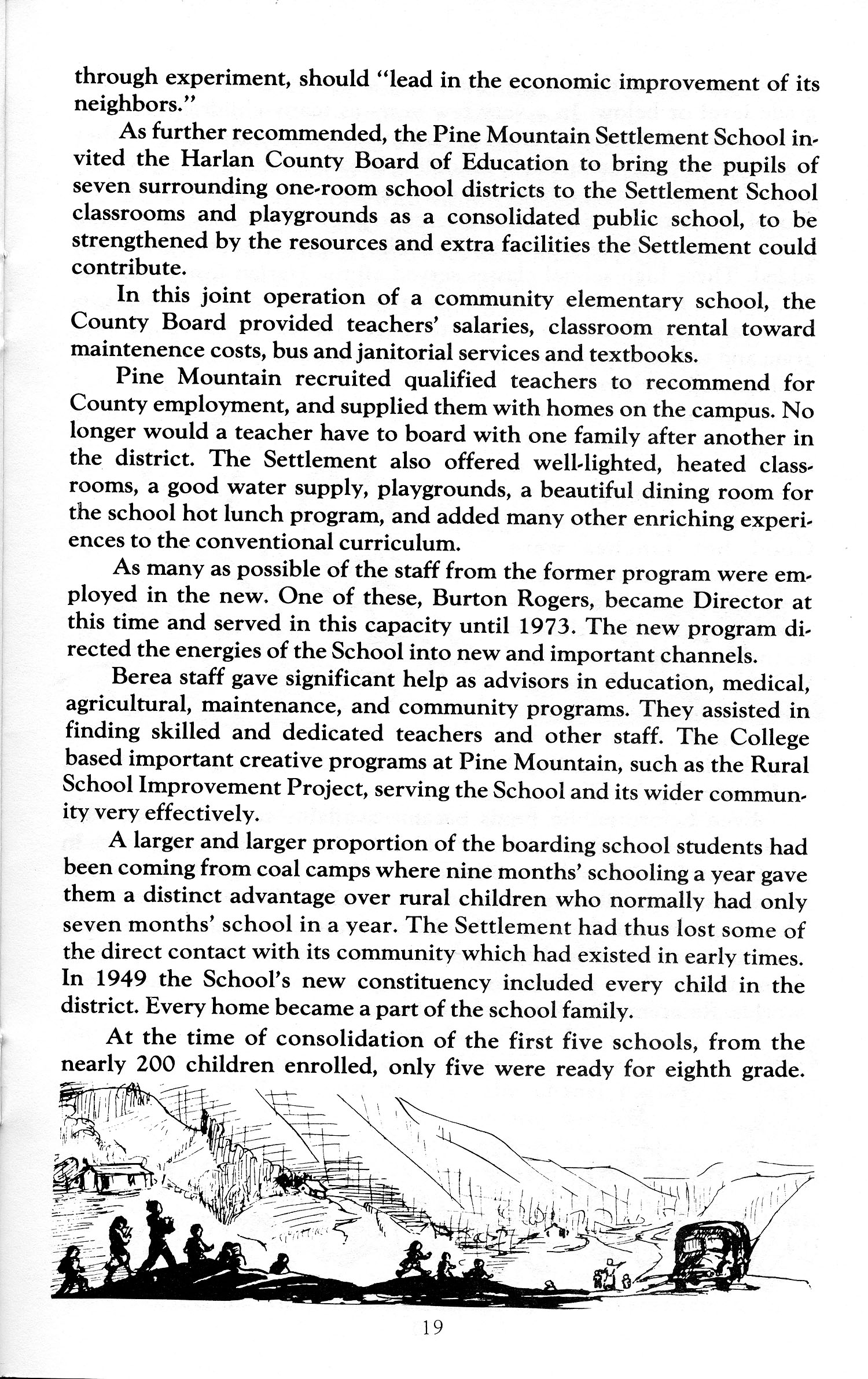 TAGS: The Pine Mountain Story – Ch. IV ; Community School in Cooperation with the County: 1949-1972 ; World War II effects ; county schools ; endowment fund ; end of boarding high school ; Berea College affiliation ; Burton Rogers ; children’s library ; student activities ; overseas visitors ; Pre-School ; health services ; community employment ;