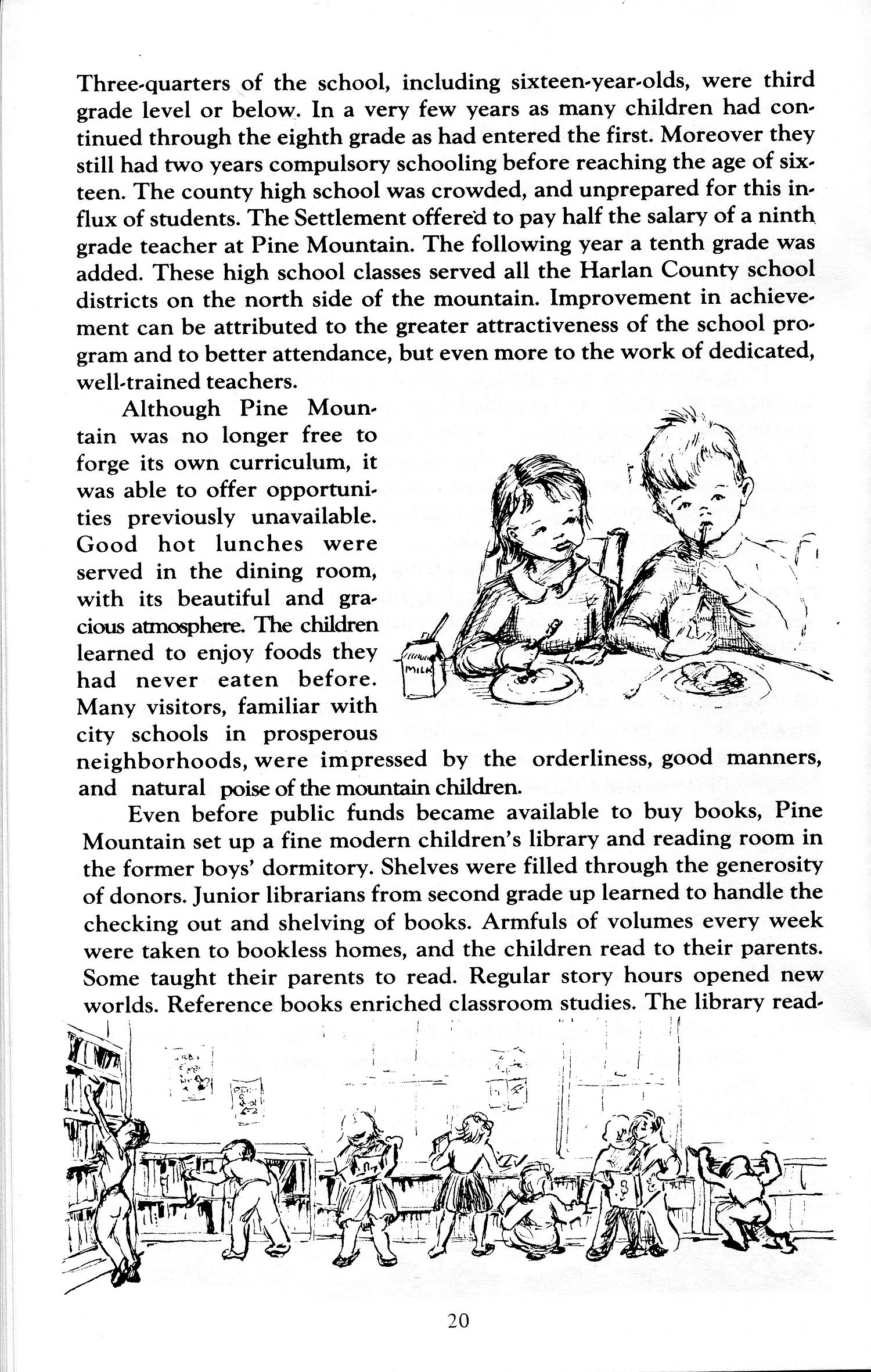 Even before public funds became available to buy books, Pine Mountain set up a fine modern children’s library and reading room in the former boys’ dormitory. Shelves were filled through the generosity of donors. Junior librarians from second grade up learned to handle the checking out and shelving of books. Armfuls of volumes every week were taken to bookless homes, and the children read to their parents. Some taught their parents to read. Regular story hours opened new worlds. Reference books enriched classroom studies. The library read-…