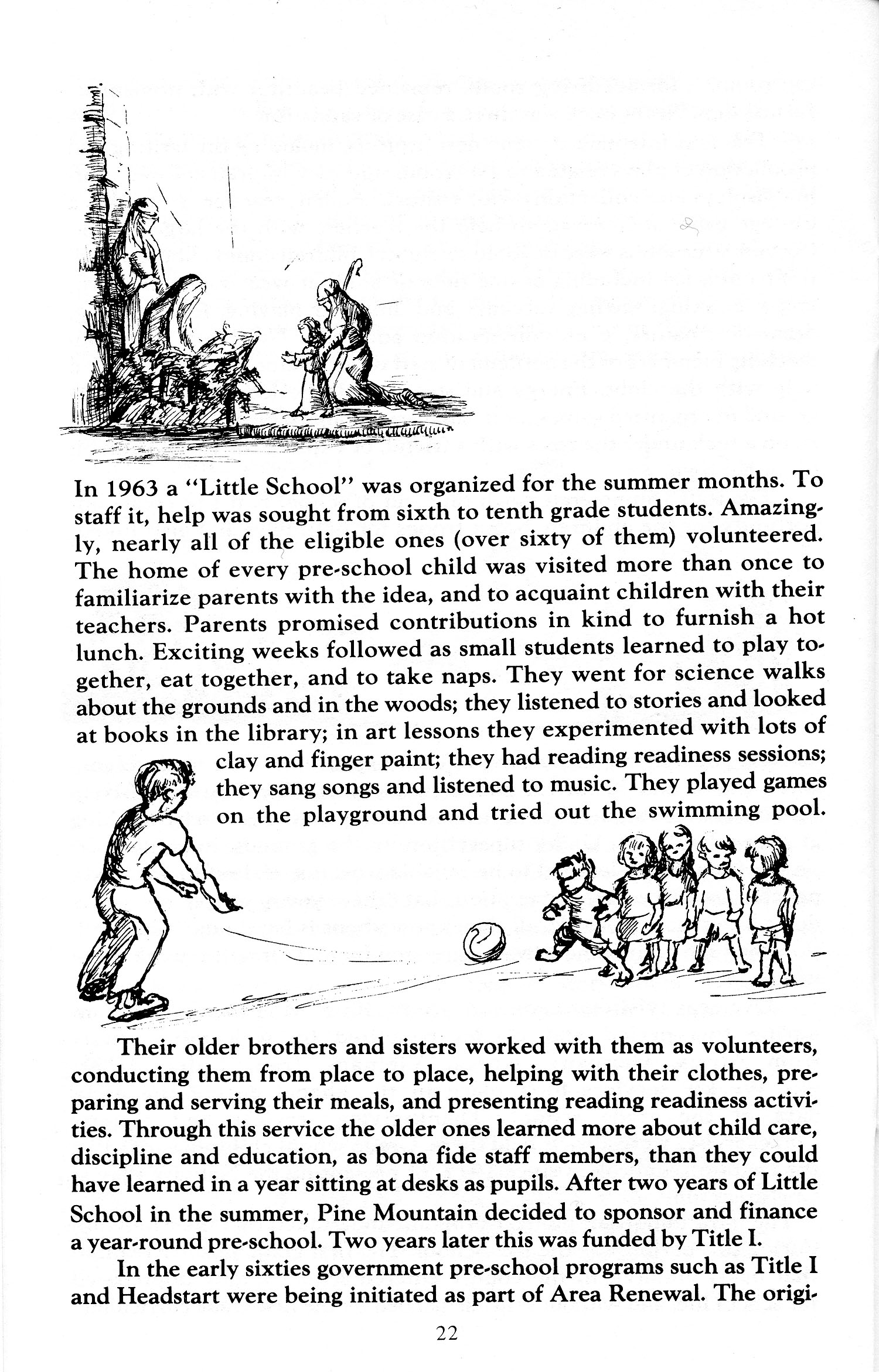 Their older brothers and sisters worked with them as volunteers, conducting them from place to place, helping with their clothes, preparing and serving their meals, and presenting reading readiness activities. Through this service the older ones learned more about child care, discipline and education, as bona fide staff members, than they could have learned in a year sitting at desks as pupils. After two years of Little School in the summer, Pine Mountain decided to sponsor and finance a year-round pre-school. Two years later this was funded by Title I.