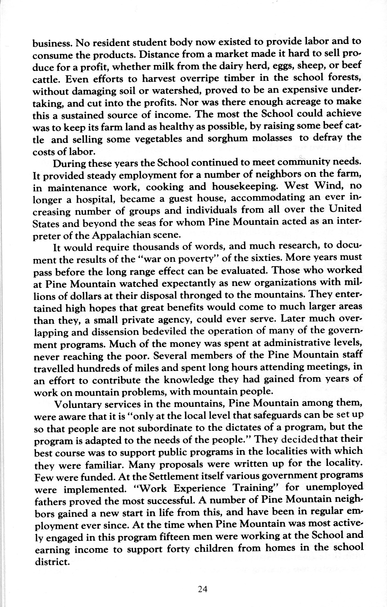 Voluntary services in the mountains, Pine Mountain among them, were aware that it is “only at the local level that safeguards can be set up so that people are not subordinate to the dictates of a program, but the program is adapted to the needs of the people.” They decided that their best course was to support public programs in the localities with which they were familiar. Many proposals were written up for the locality. Few were funded. At the Settlement itself various government programs were implemented. “Work Experience Training” for unemployed fathers proved the most successful. A number of Pine Mountain neighbors gained a new start in life from this, and have been in regular employment ever since. At the time when Pine Mountain was most actively engaged in this program fifteen men were working at the School and earning income to support forty children from homes in the school district.