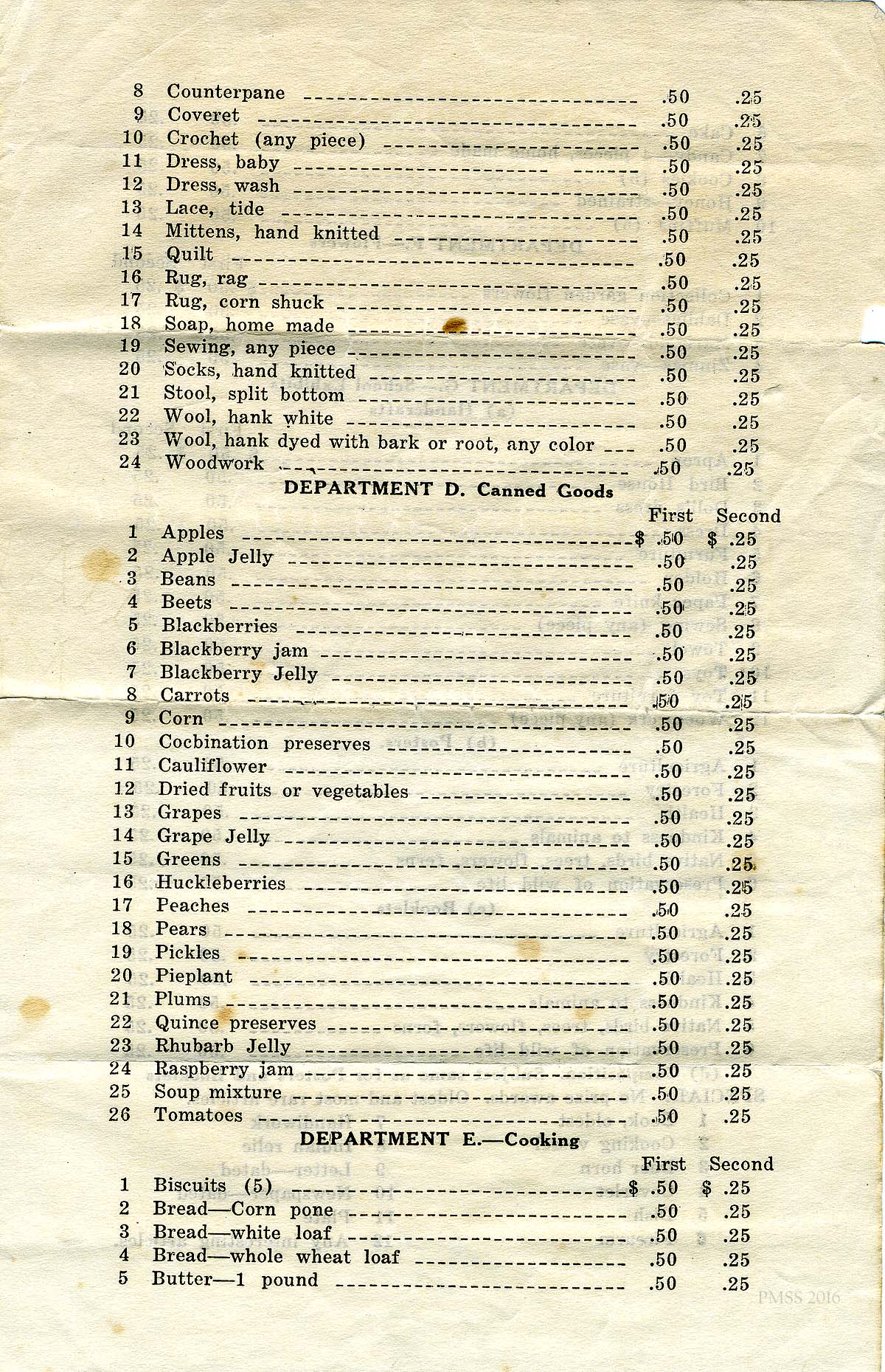 - [Continuation of program] Department F — Flowers ; Department G — School Exhibits (handcrafts, Posters, Booklets, Composition. SPECIAL: “No prize awards. Oldest and most rare articles (Book, Cooking vessel, Deer horn, Coverlet, Dish, Firearm, Handiwork, Indian relic, Letter, dated , Newspaper, dated, Plate, Any interesting articles. )