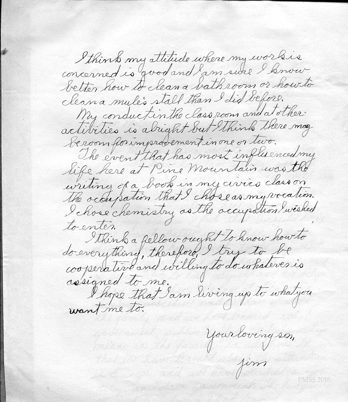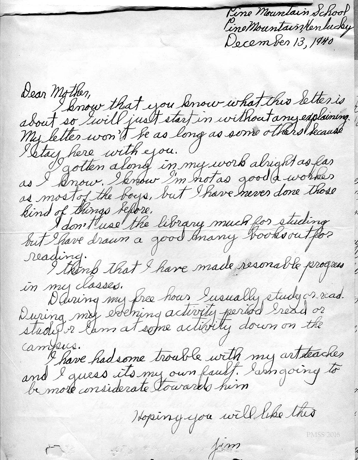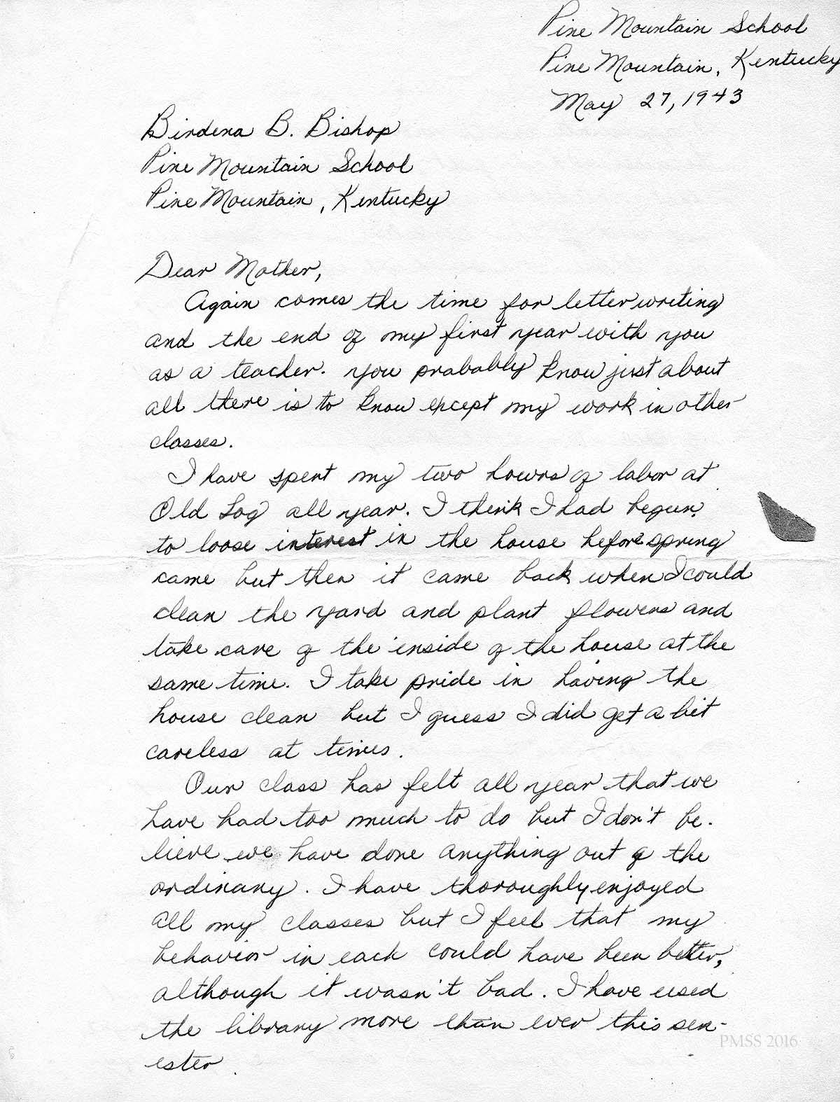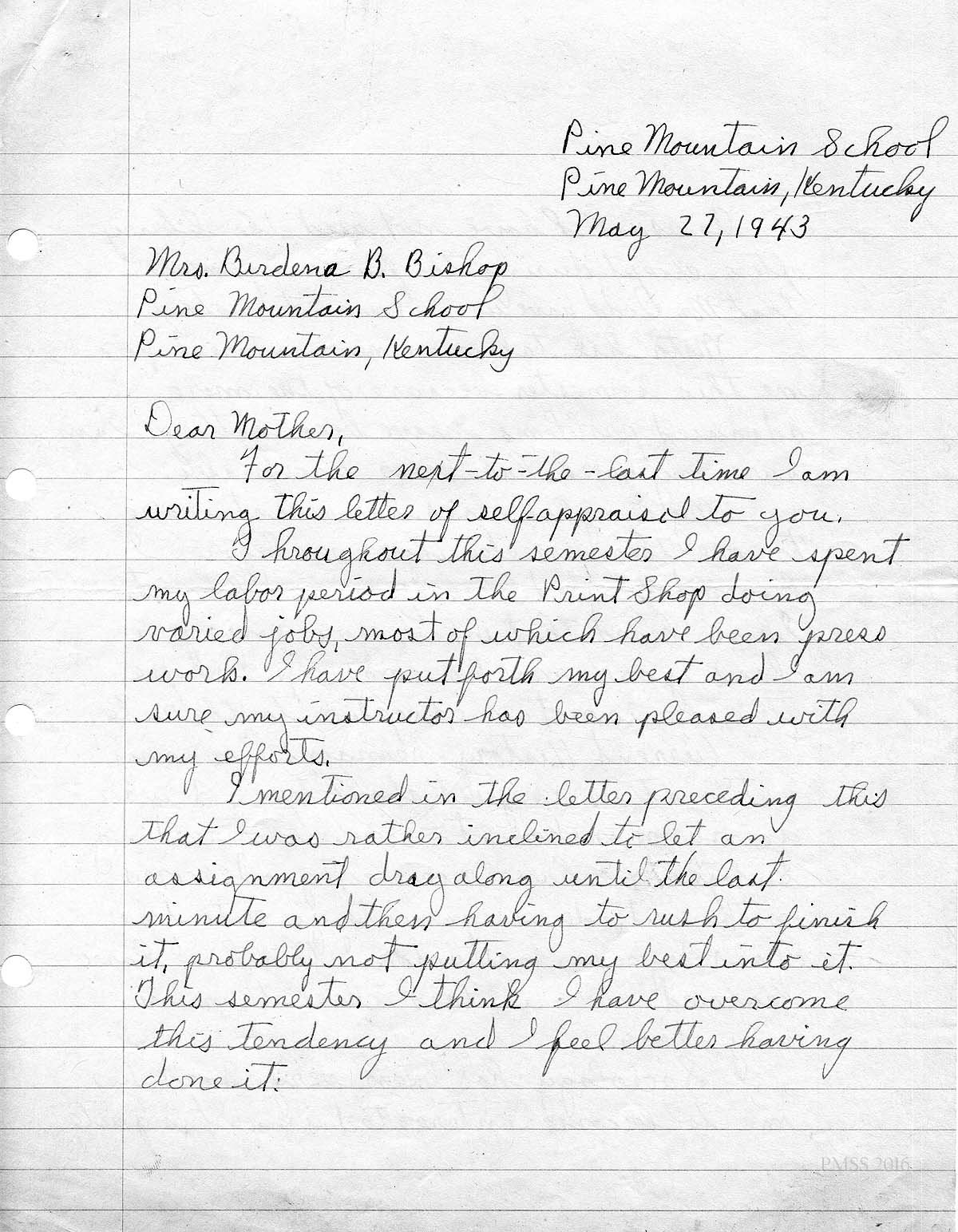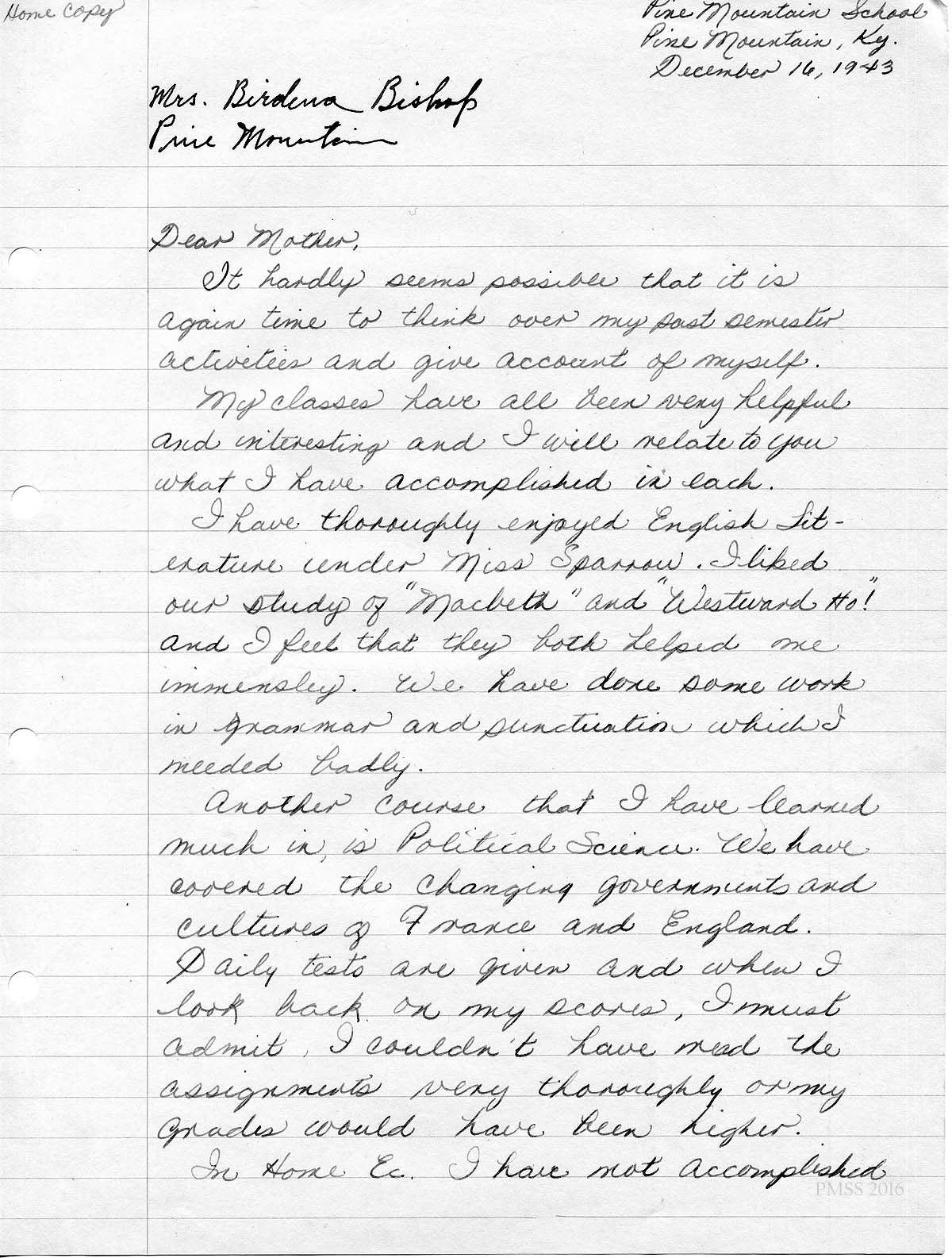 While at Pine Mountain all students in the program were required to write a self-report to be sent to parents. It was to reflect how the student saw their progress for the year. The following letters were written by Mary Jane and James Bishop to their mother Birdena Bishop. They were saved by Birdena in her Scrapbook assembled with highlights of her years at Pine Mountian (1940 – 1944) . The reports of her children represent the years of 1940-1943.