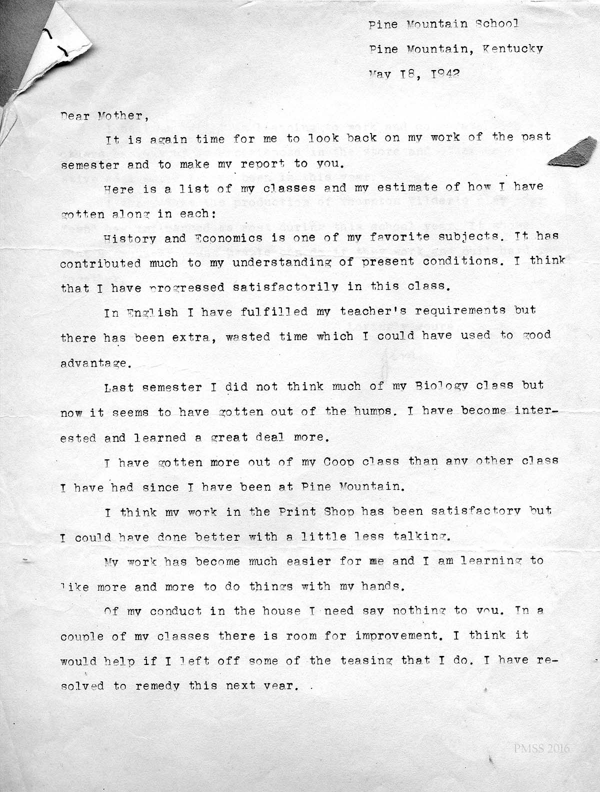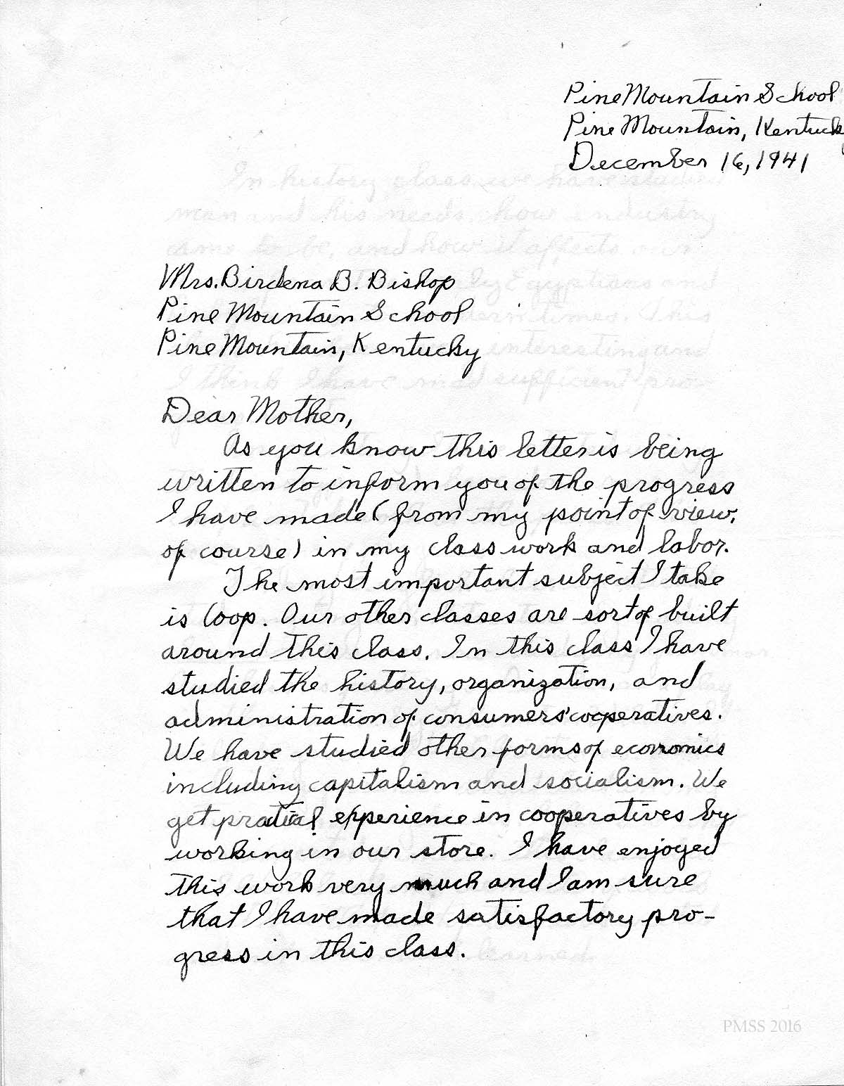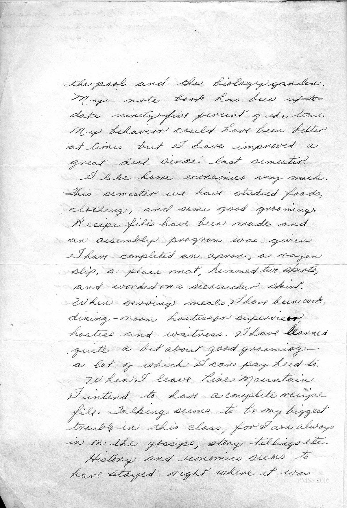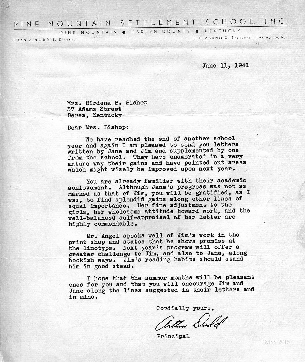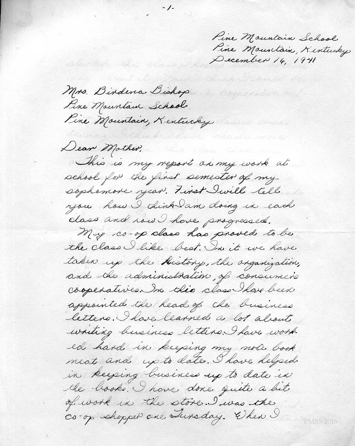 While at Pine Mountain all students in the program were required to write a self-report to be sent to parents. It was to reflect how the student saw their progress for the year. The following letters were written by Mary Jane and James Bishop to their mother Birdena Bishop. They were saved by Birdena in her Scrapbook assembled with highlights of her years at Pine Mountian (1940 – 1944) . The reports of her children represent the years of 1940-1943.
