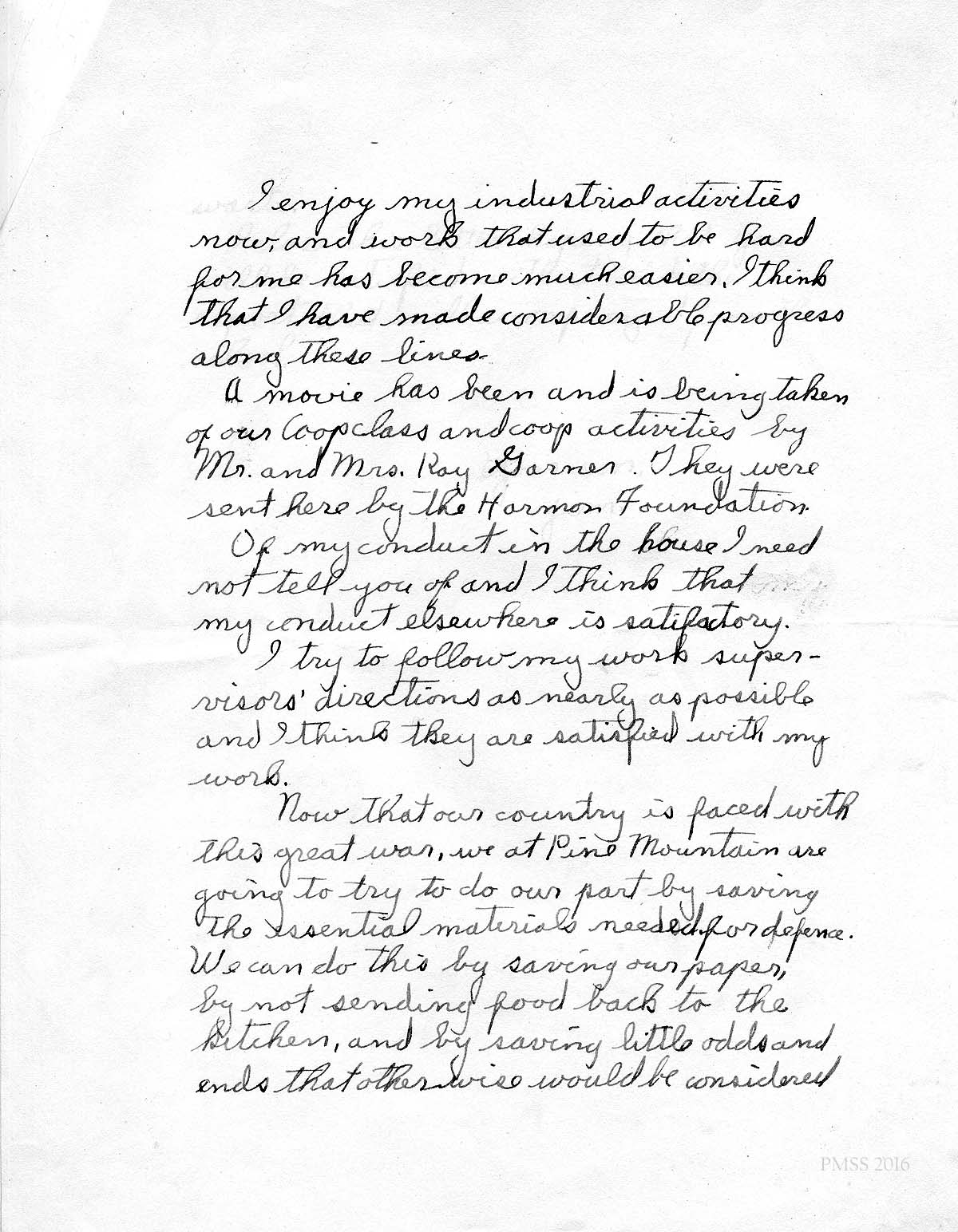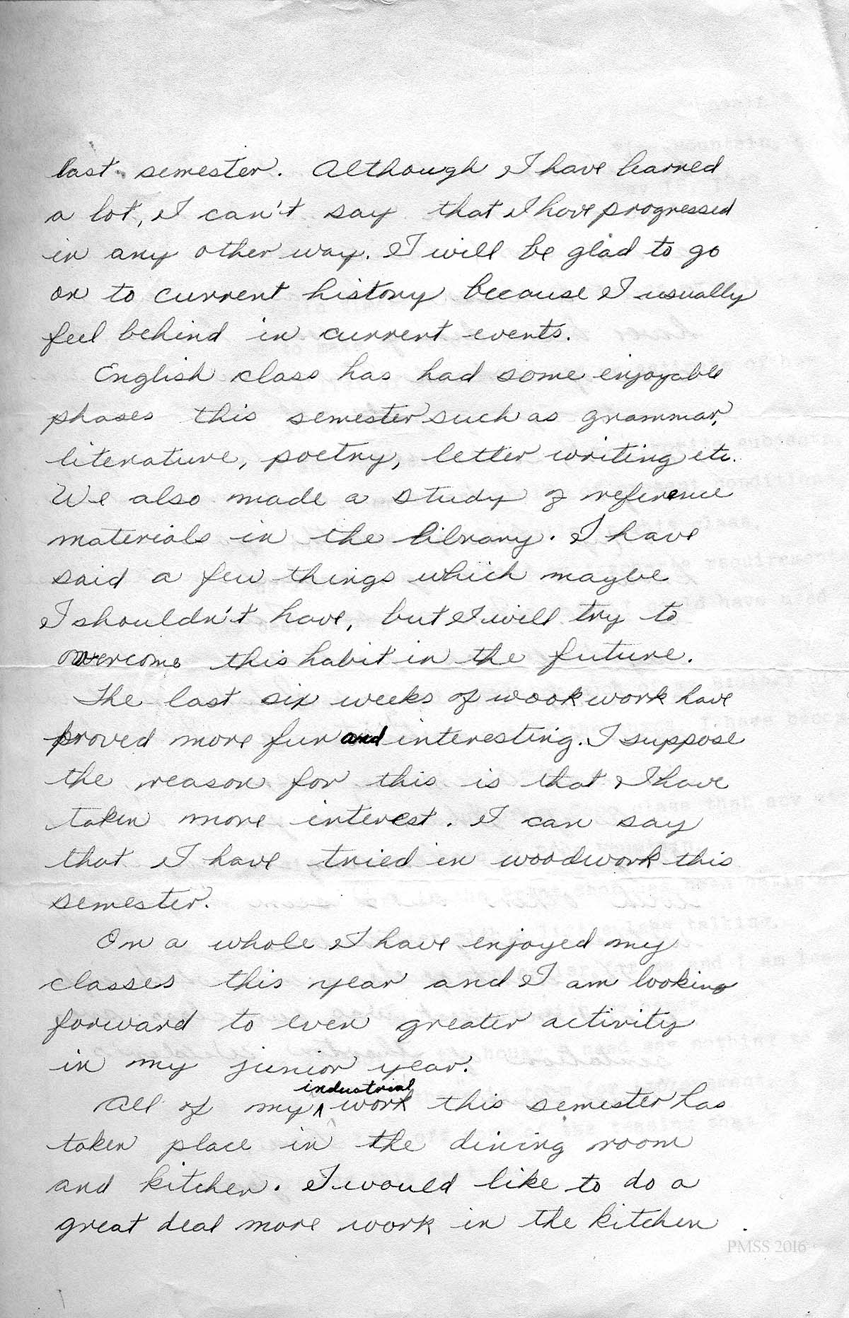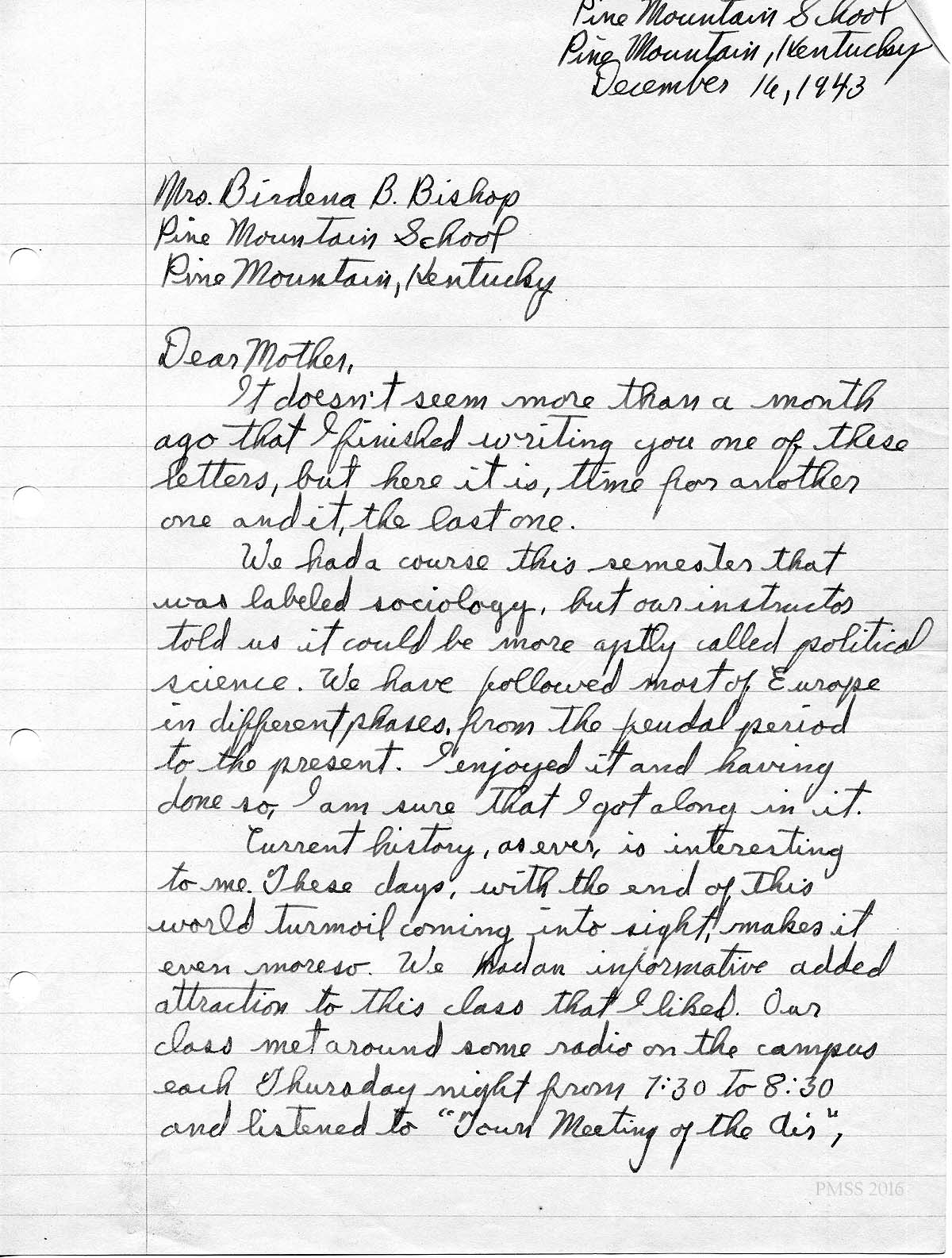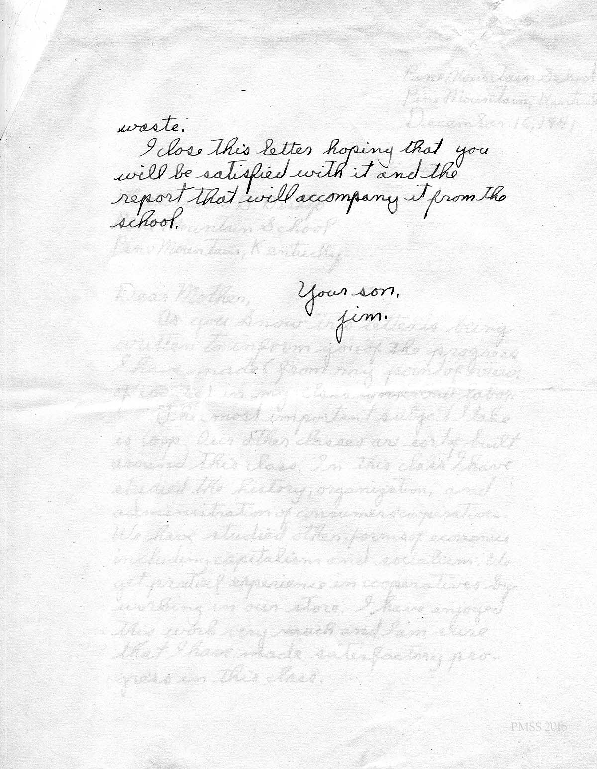 While at Pine Mountain all students in the program were required to write a self-report to be sent to parents. It was to reflect how the student saw their progress for the year. The following letters were written by Mary Jane and James Bishop to their mother Birdena Bishop. They were saved by Birdena in her Scrapbook assembled with highlights of her years at Pine Mountian (1940 – 1944) . The reports of her children represent the years of 1940-1943.