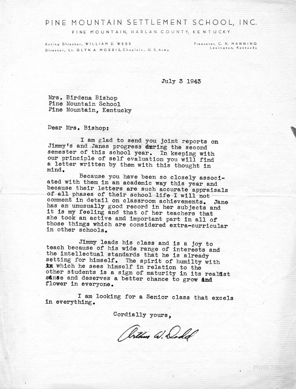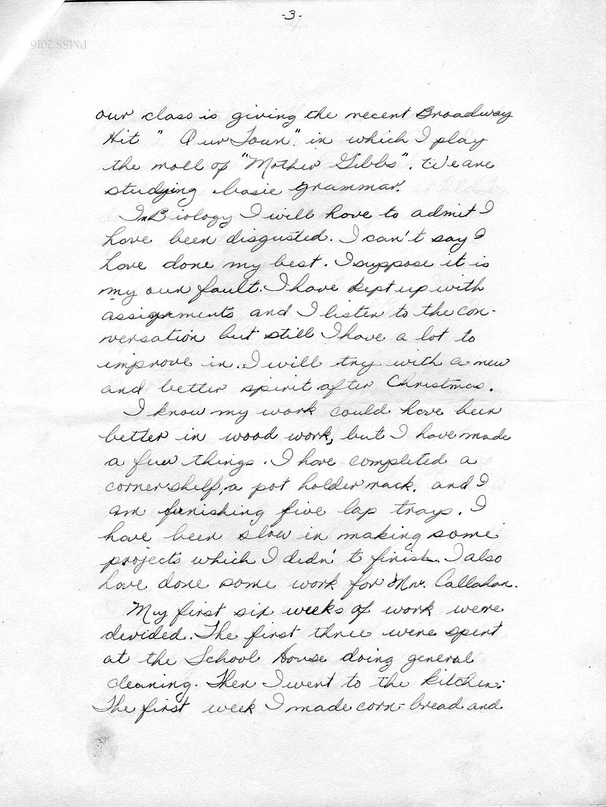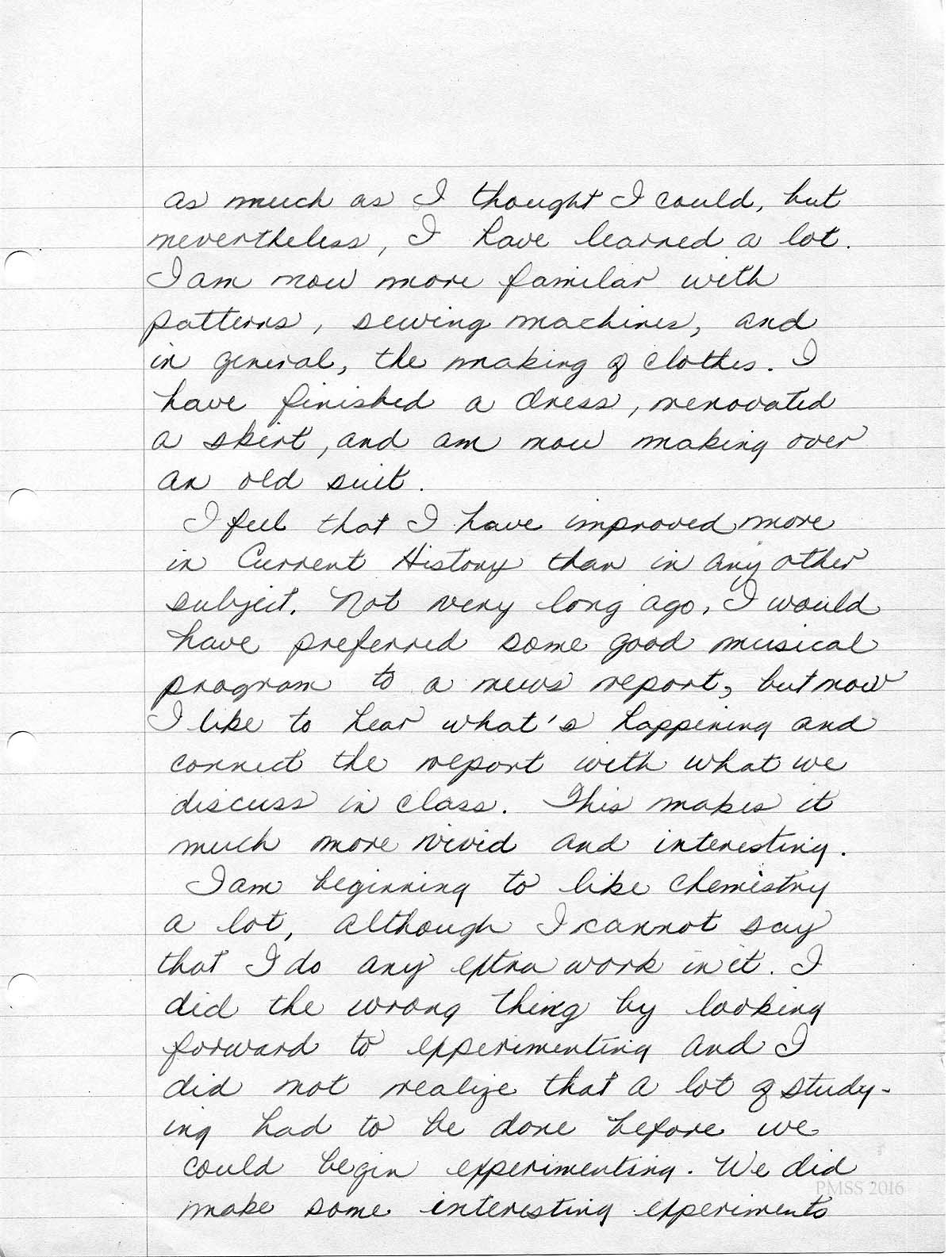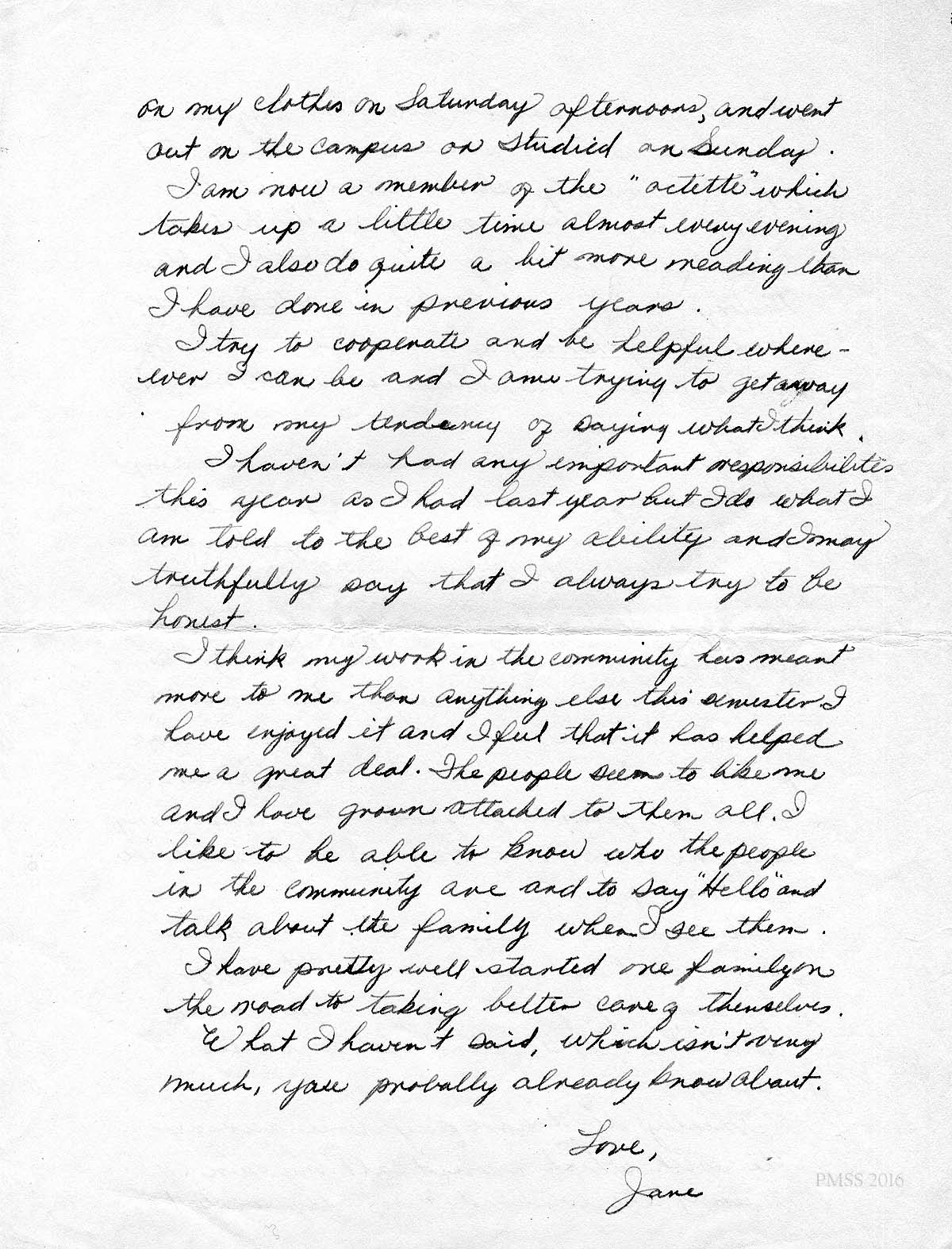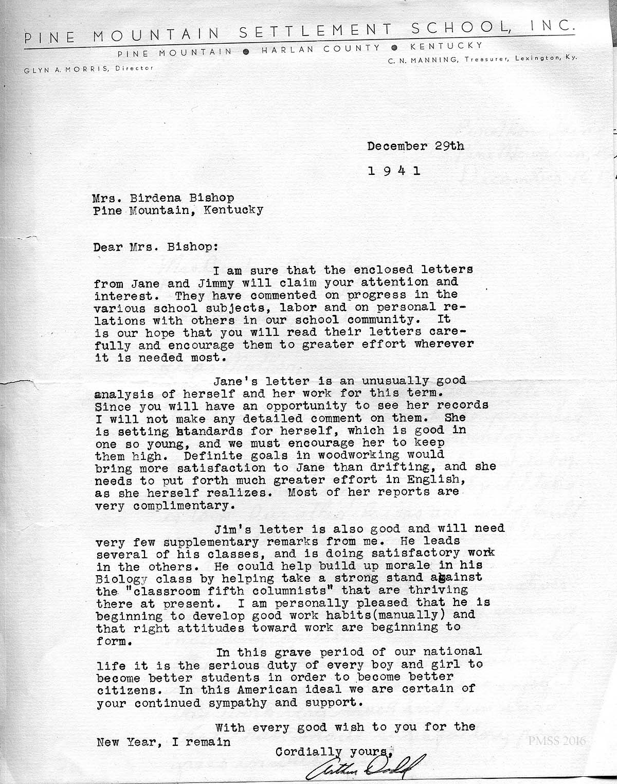 While at Pine Mountain all students in the program were required to write a self-report to be sent to parents. It was to reflect how the student saw their progress for the year. The following letters were written by Mary Jane and James Bishop to their mother Birdena Bishop. They were saved by Birdena in her Scrapbook assembled with highlights of her years at Pine Mountian (1940 – 1944) . The reports of her children represent the years of 1940-1943.