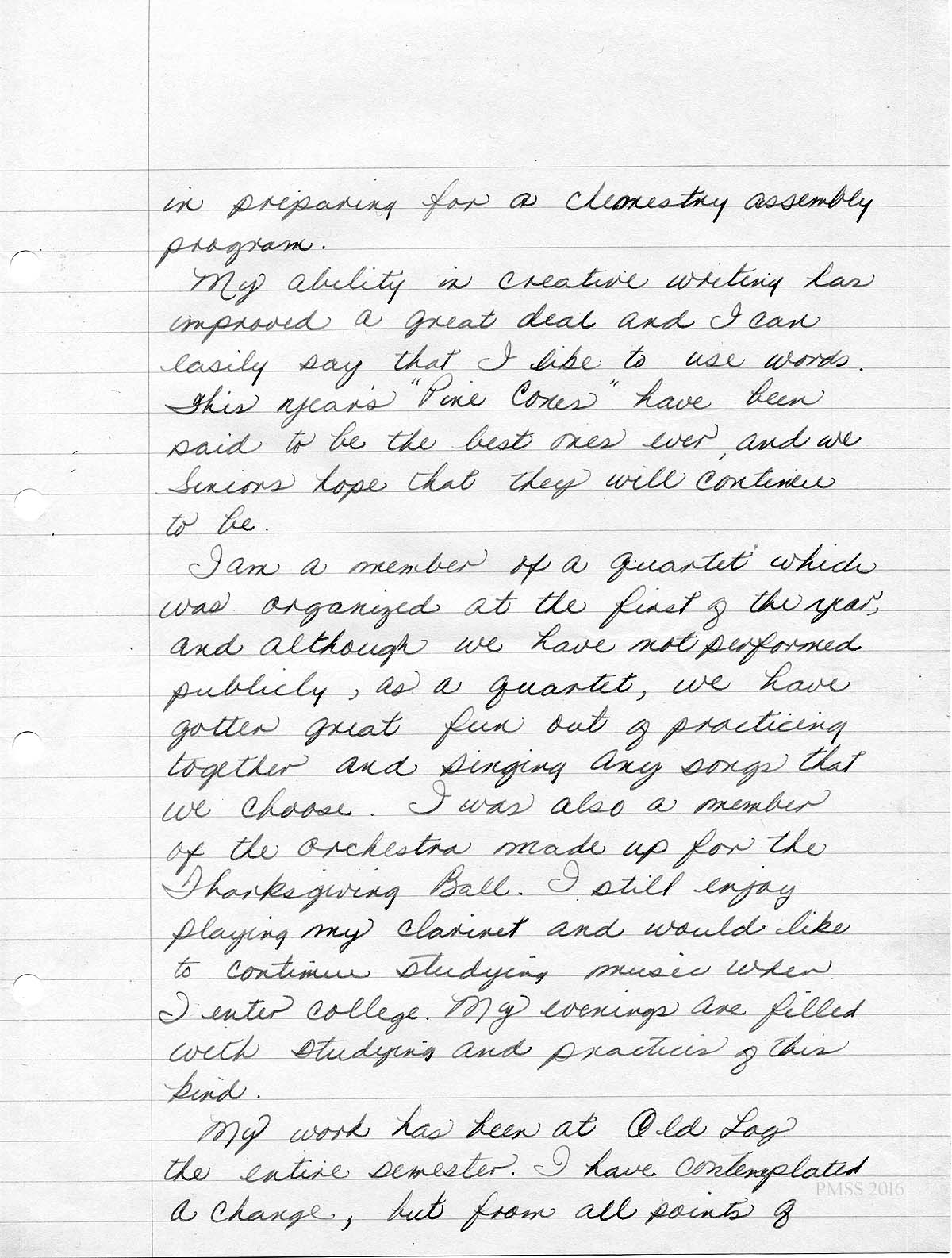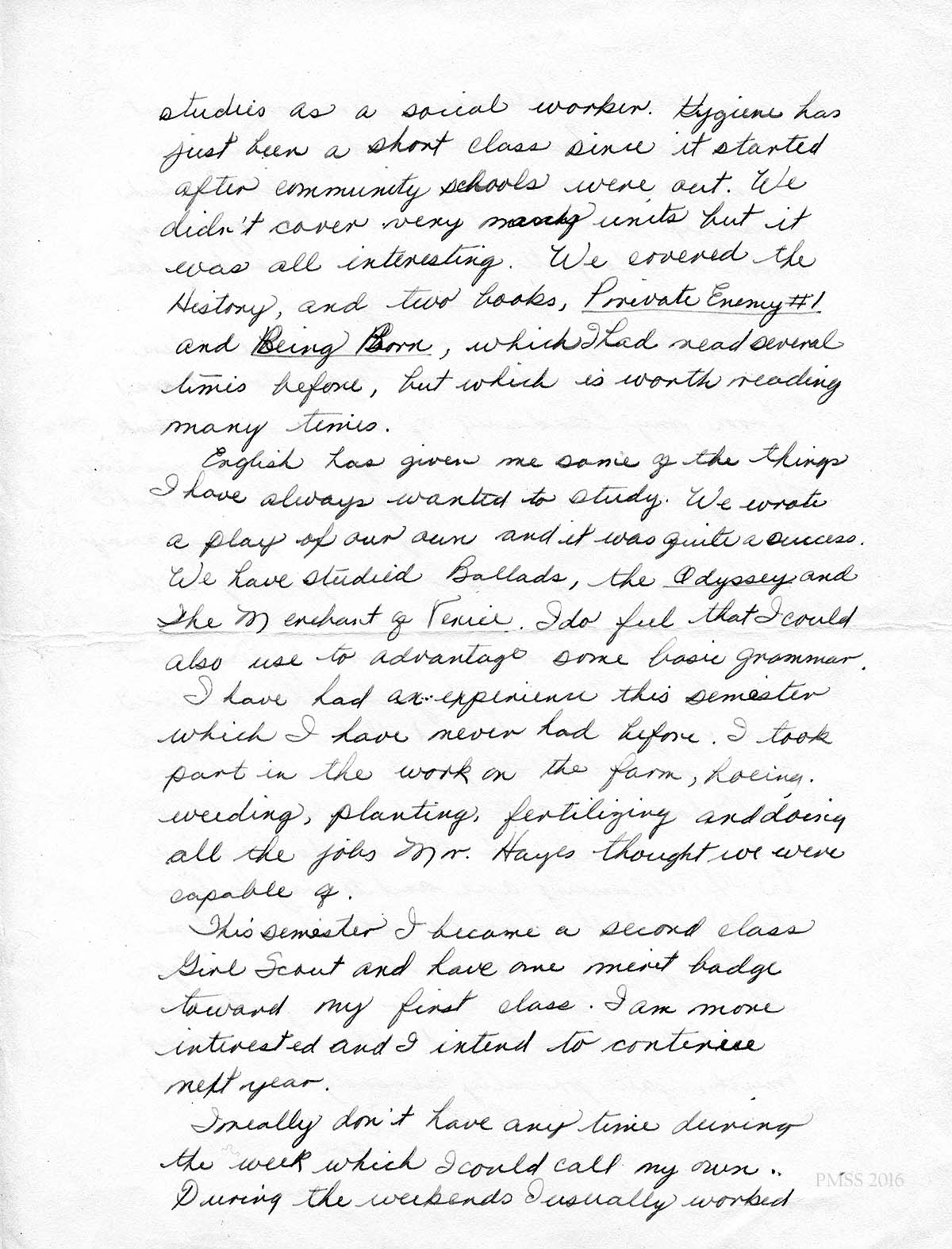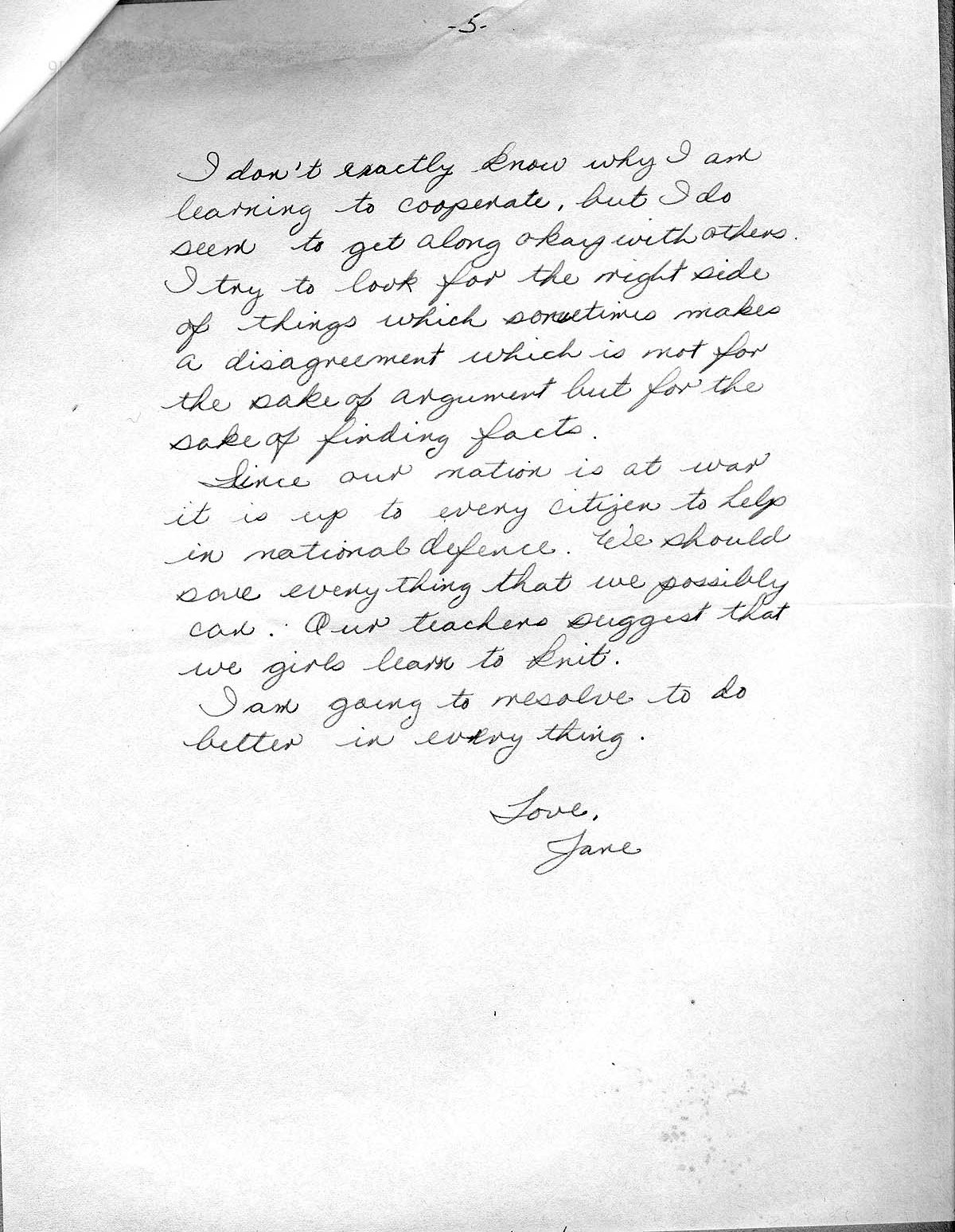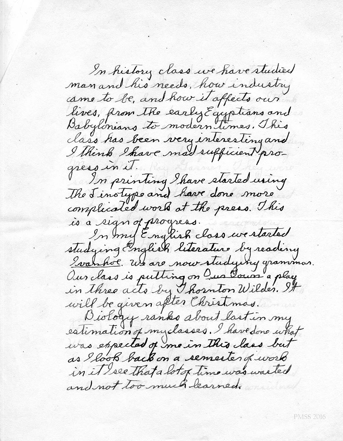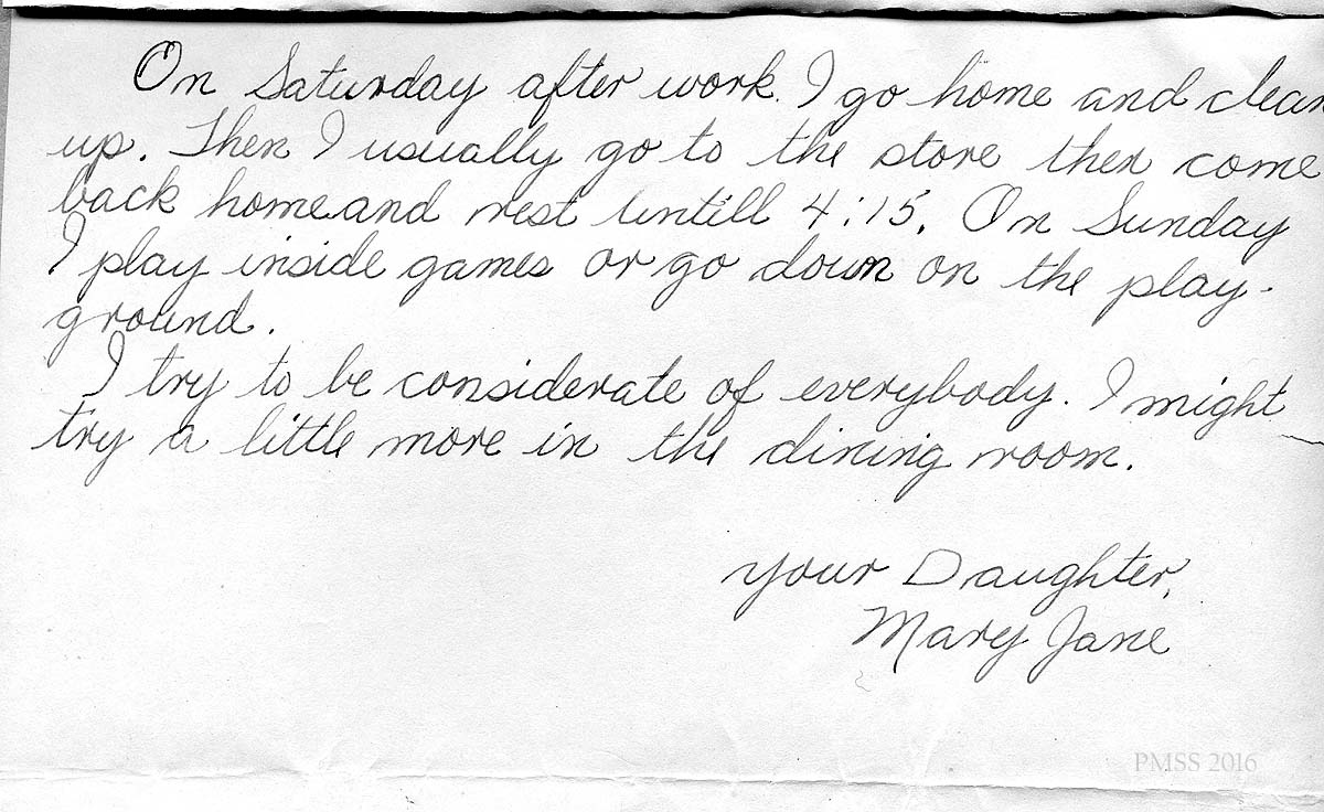 While at Pine Mountain all students in the program were required to write a self-report to be sent to parents. It was to reflect how the student saw their progress for the year. The following letters were written by Mary Jane and James Bishop to their mother Birdena Bishop. They were saved by Birdena in her Scrapbook assembled with highlights of her years at Pine Mountian (1940 – 1944) . The reports of her children represent the years of 1940-1943.