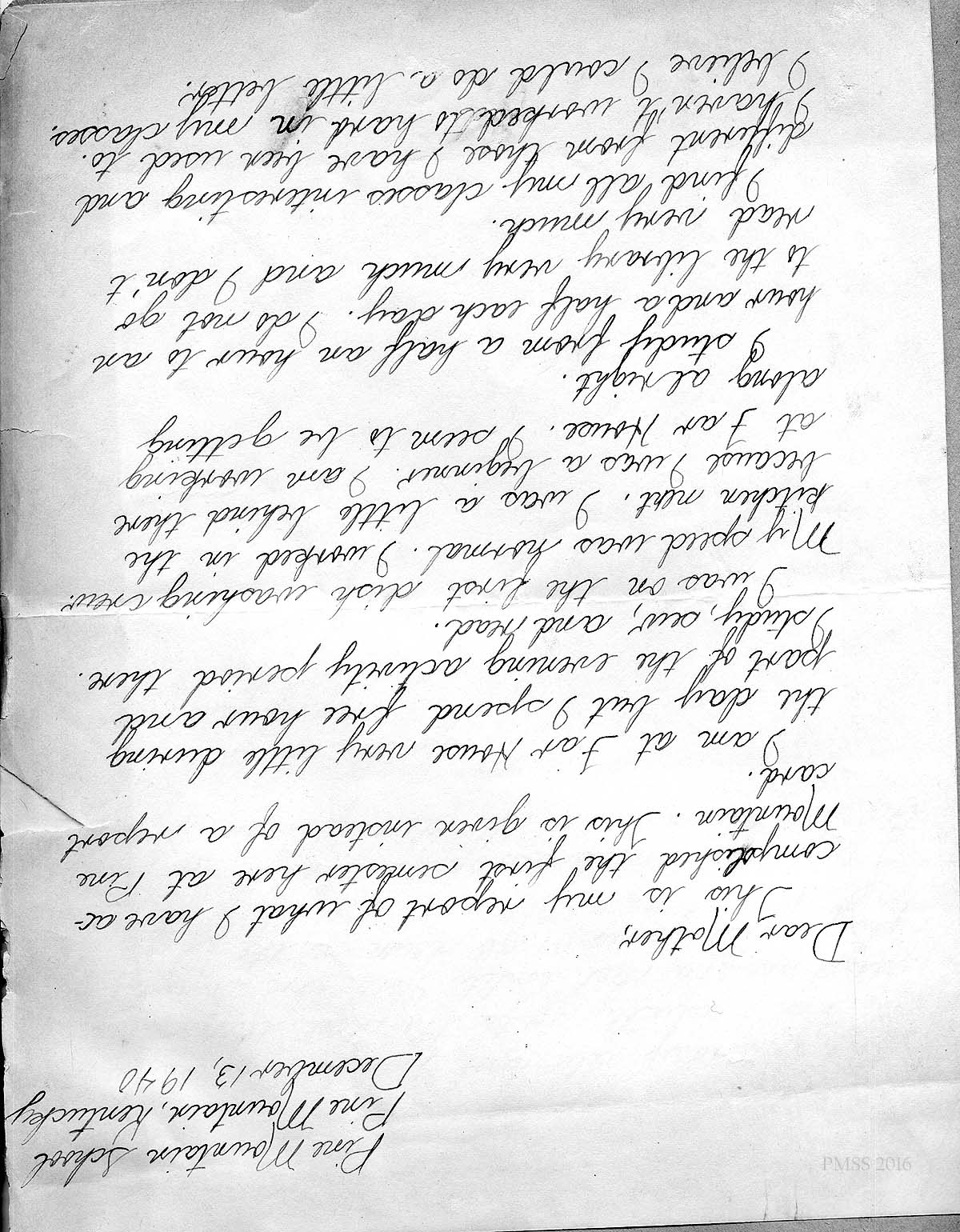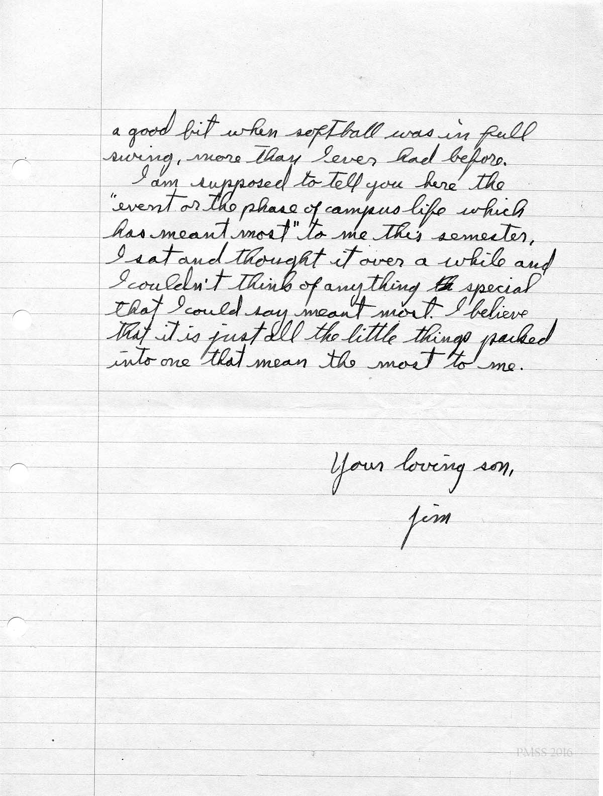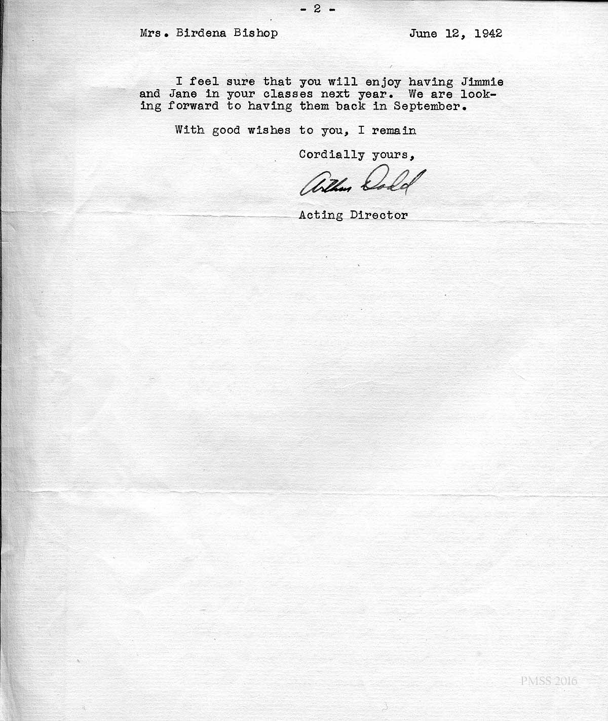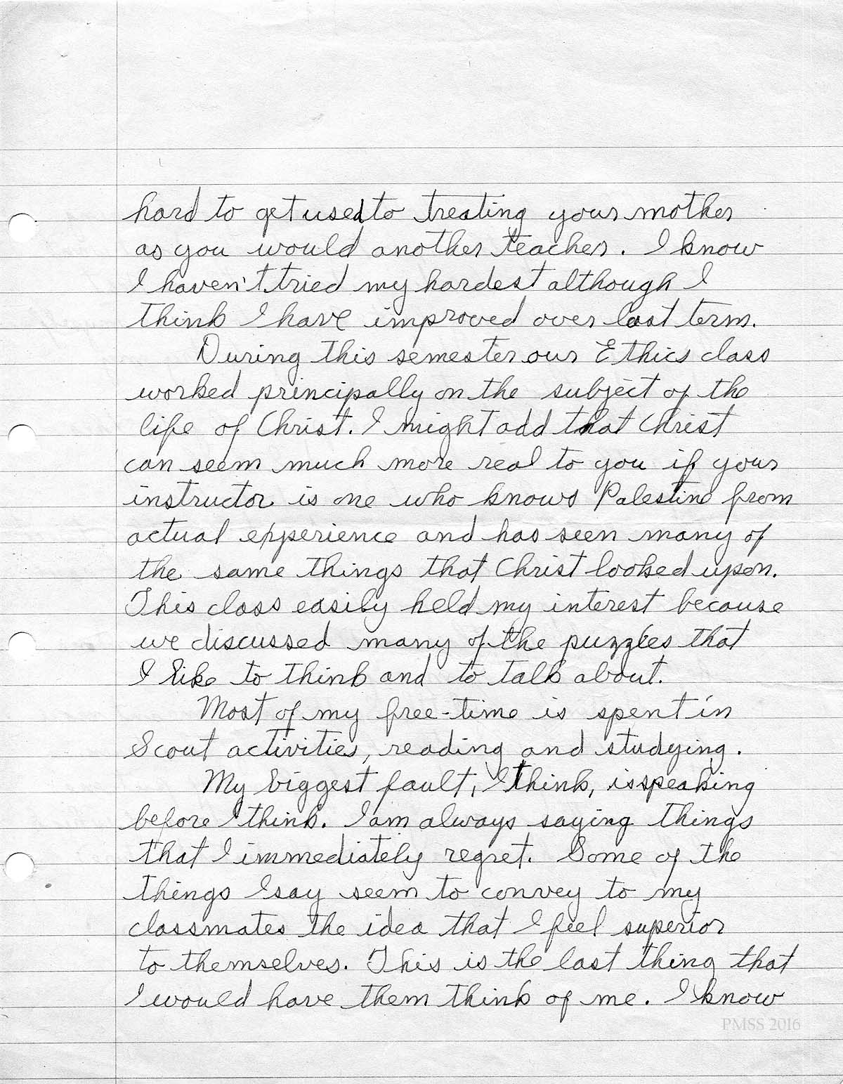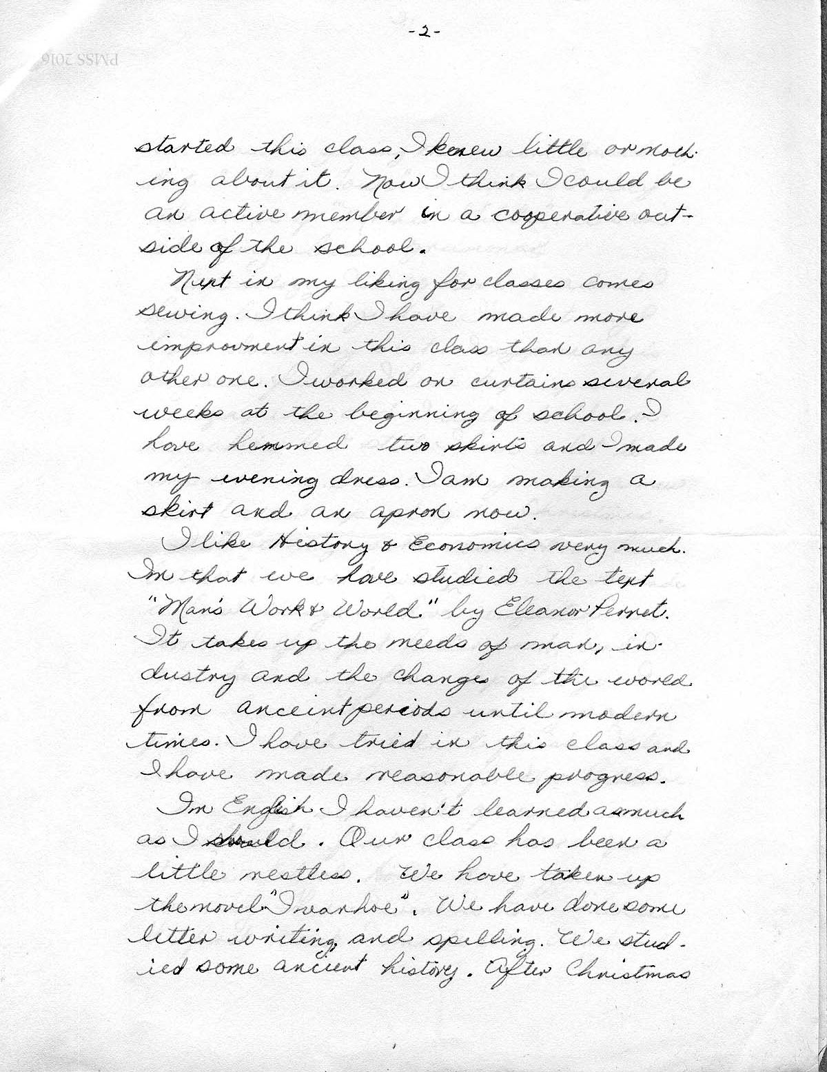 While at Pine Mountain all students in the program were required to write a self-report to be sent to parents. It was to reflect how the student saw their progress for the year. The following letters were written by Mary Jane and James Bishop to their mother Birdena Bishop. They were saved by Birdena in her Scrapbook assembled with highlights of her years at Pine Mountian (1940 – 1944) . The reports of her children represent the years of 1940-1943.