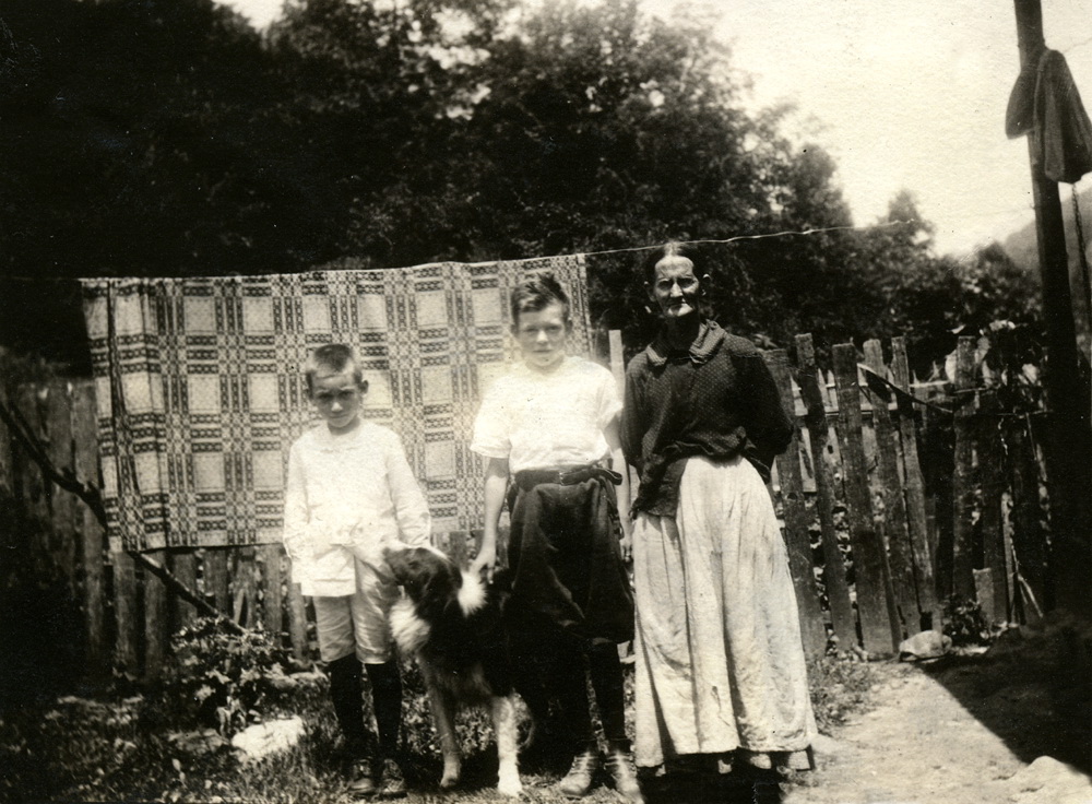- 22Friends & Neighbors : Woman with two boys and dog. Quilt coverlet hangs on line behind group. Vl_34_1099a_mod.jpg