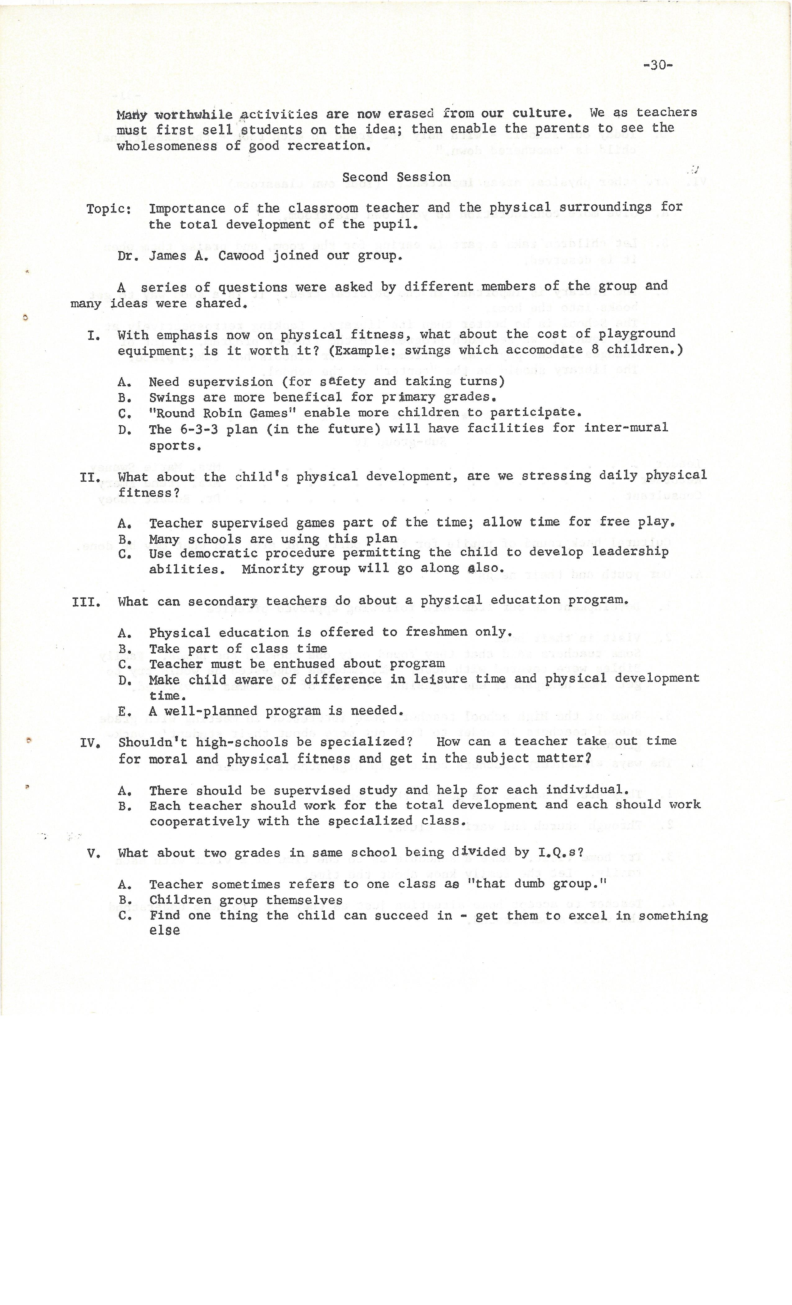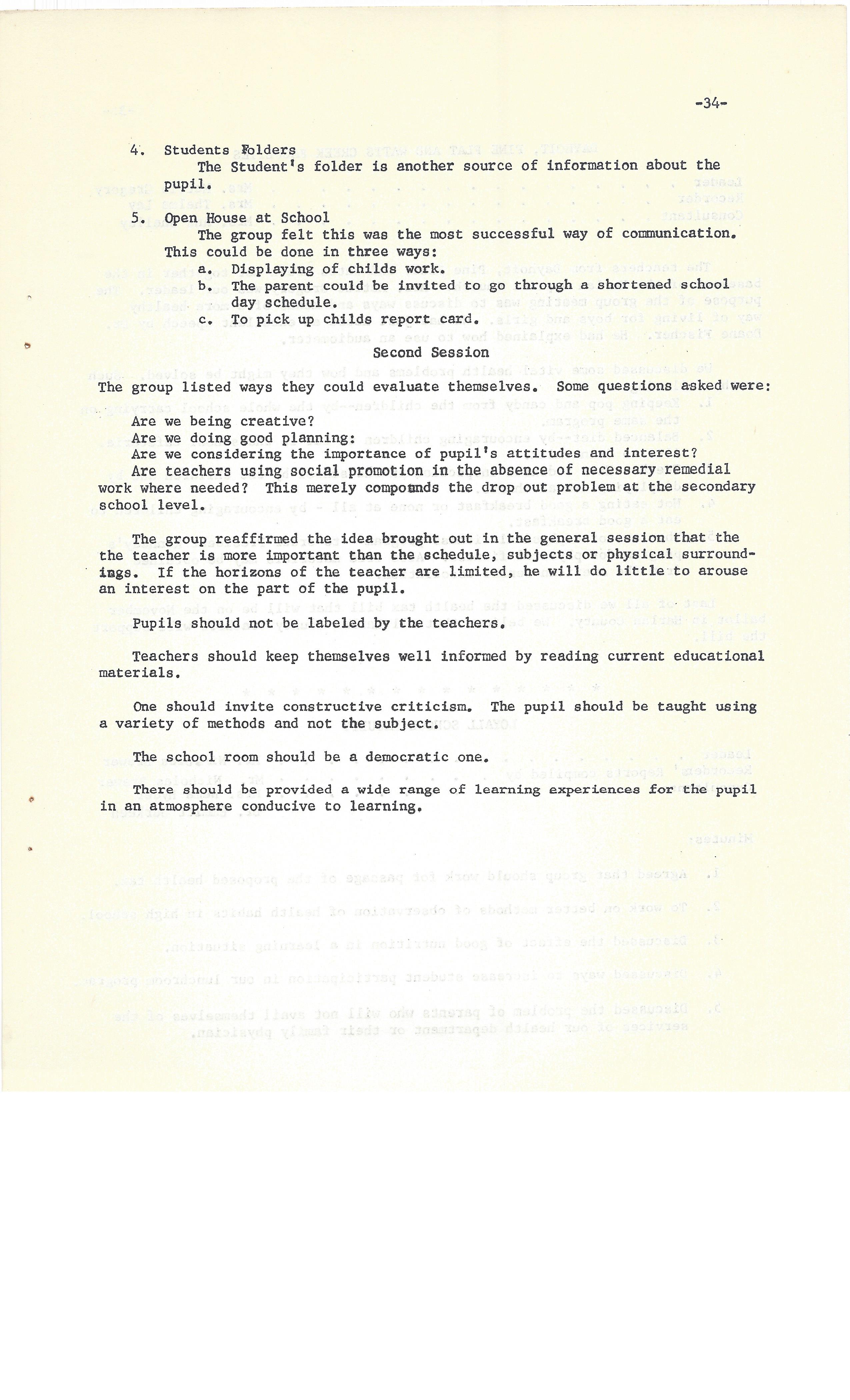 The group reaffirmed the idea brought out in the general session that the teacher is more important than the schedule, subjects or physical surroundings. If the horizons of the teacher are limited, he will do little to arouse an interest on the part of the pupil.