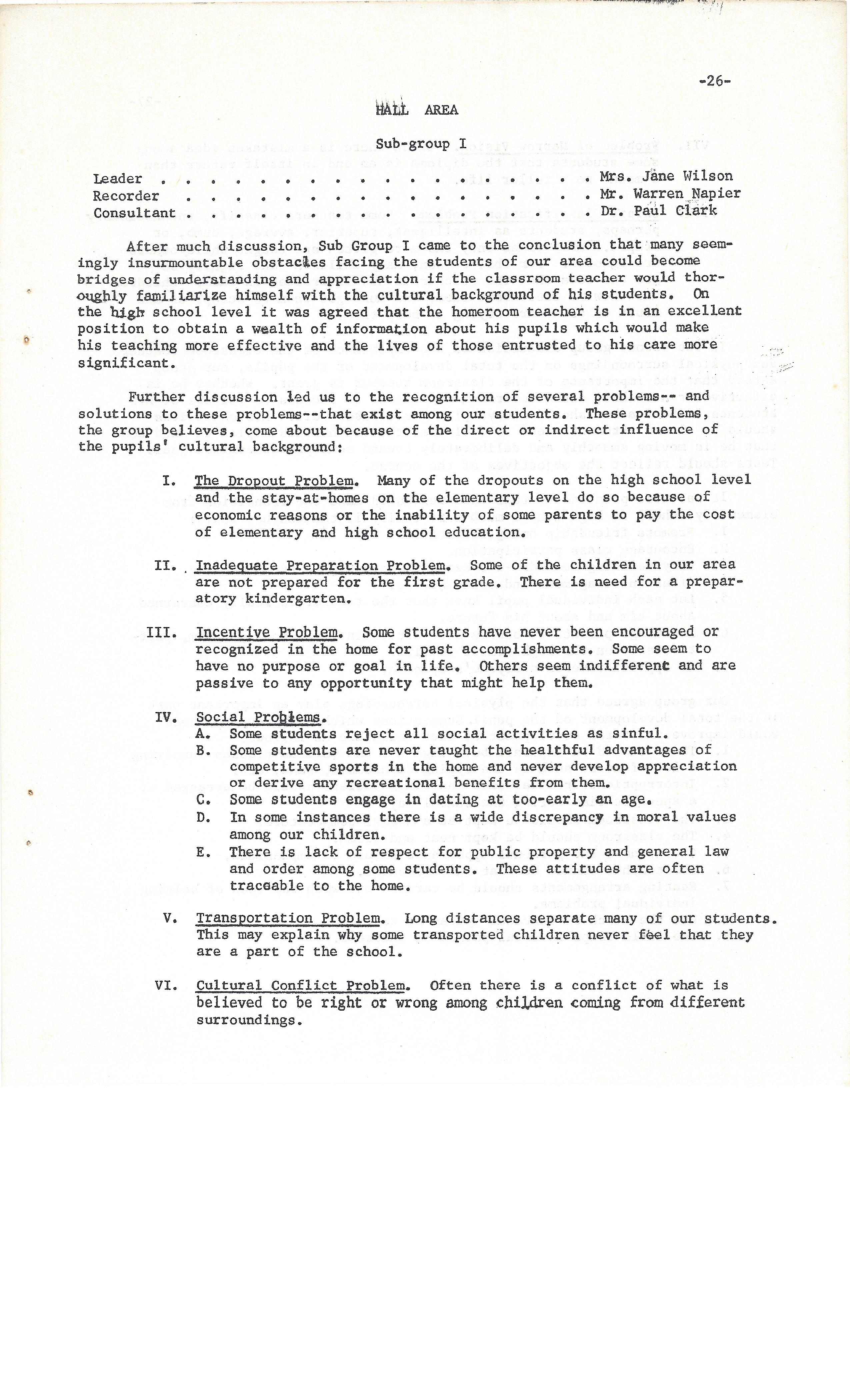 After much discussion, Sub Group I came to the conclusion that many seemingly insurmountable obstacles facing the students of our area could become bridges of understanding and appreciation if the classroom teacher would thoroughly familiarize himself with the cultural background of his students. On the high school level it was agreed that the homeroom teacher is in an excellent position to obtain a wealth of information about his pupils which would make his teaching more effective and the lives of those entrusted to his care more significant.