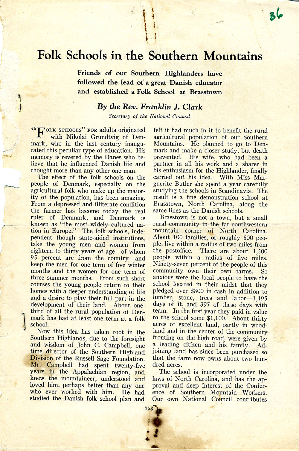 Clark, Franklin. J., Rev. “Folk Schools in the Southern Mountains: Friends of our Southern Highlanders have followed the lead of a great Danish educator and established a Folk School at Brasstown.” [from The Spirit of Missions ?], n.d.