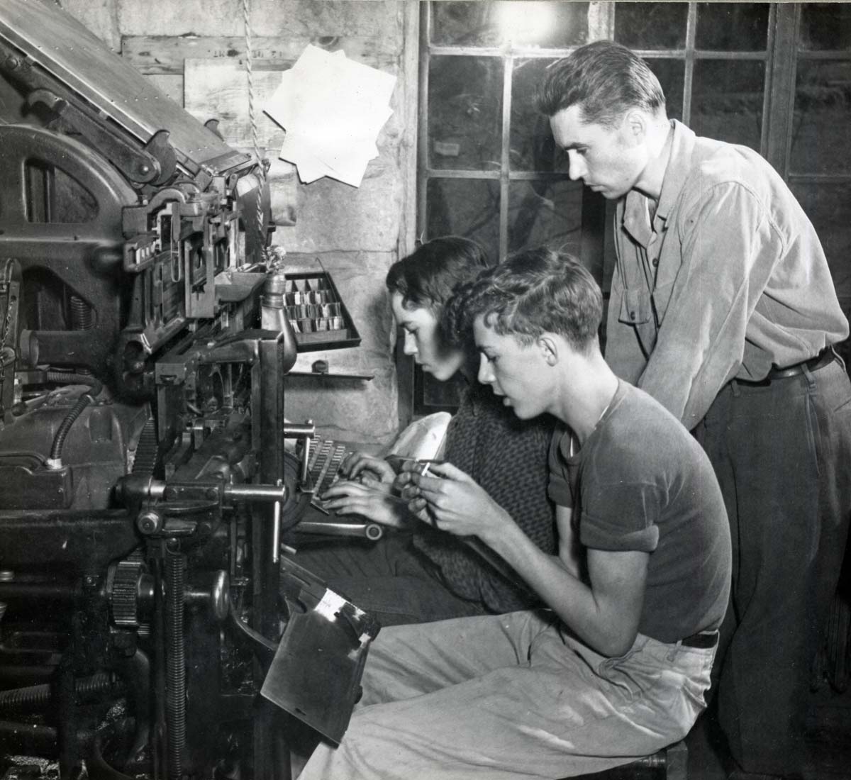 - “Print Shop, 1948. Hoid Brown, Billy Gus Howard, Mr. Nichols.” [nace_II_album_038.jpg]