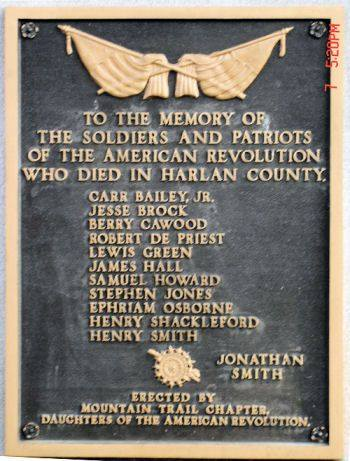 - Revolutionary War commemorative plaque mounted on a small monument in the Harlan (KY) courthouse square on the Central Street side of the courthouse. [pmss_rev_war_plaque.jpg}