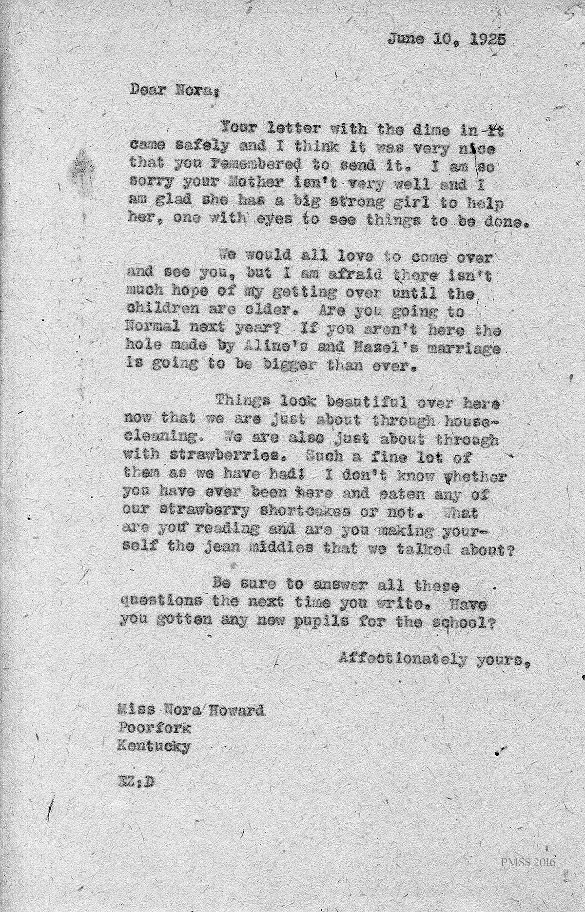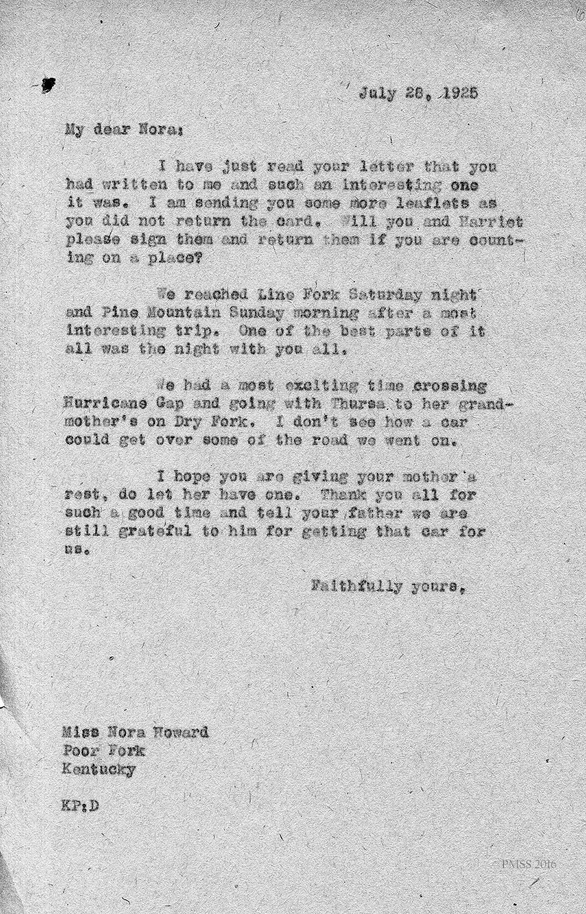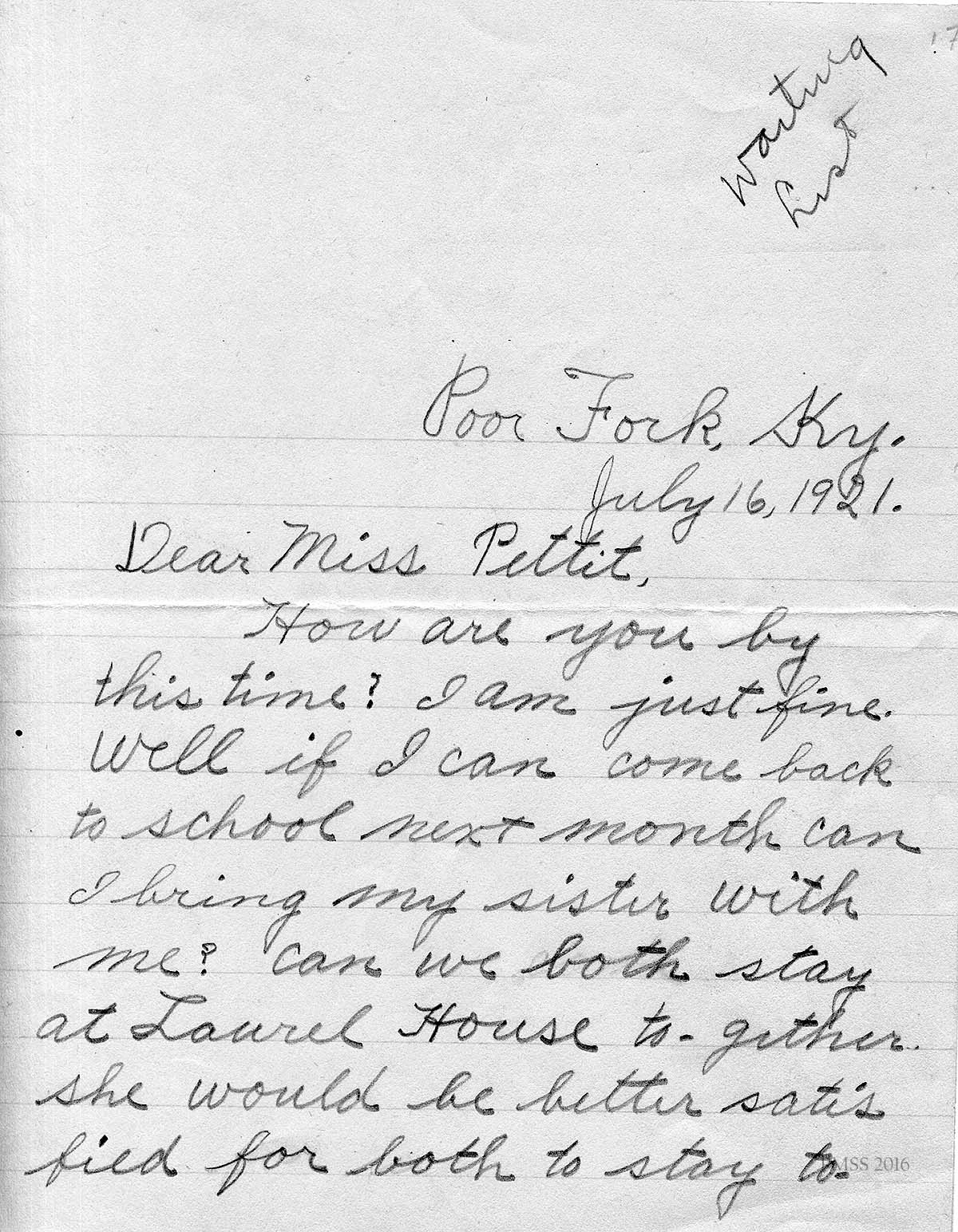 Nora first attended Pine Mountain Settlement School in 1921 as a fifth-grader [age 15] and apparently completed grade school in 1923 at age 17. She then attended part of high school, leaving the School for Berea (KY) College in the Fall of 1927. By September 1927, Nora was writing from Berea College where she was working at Boone Tavern and going to school [?]. She was then 21 years old. Harriet remained at Pine Mountain, but by 1928 her sister Nora was working to enroll her at Berea.