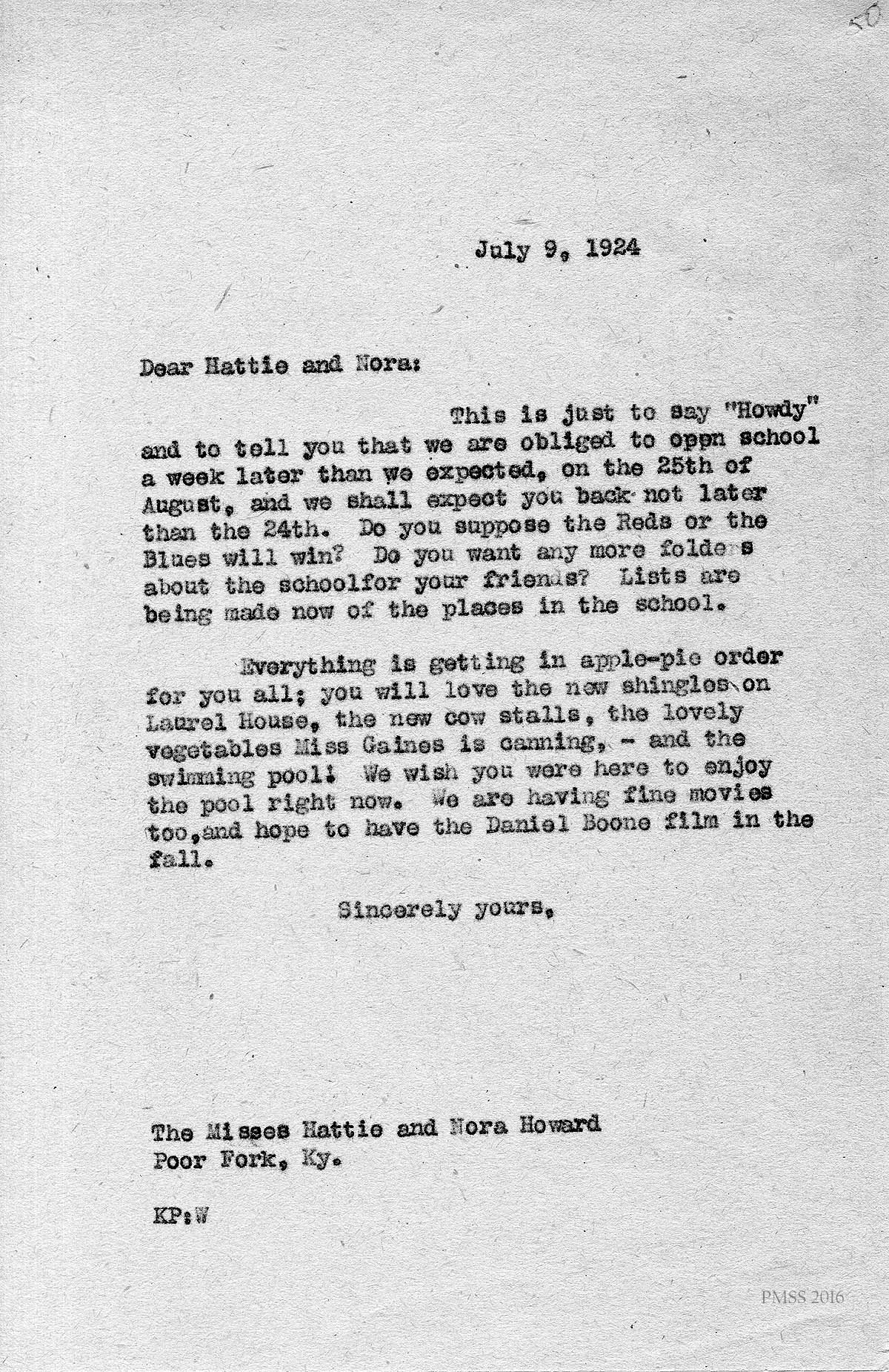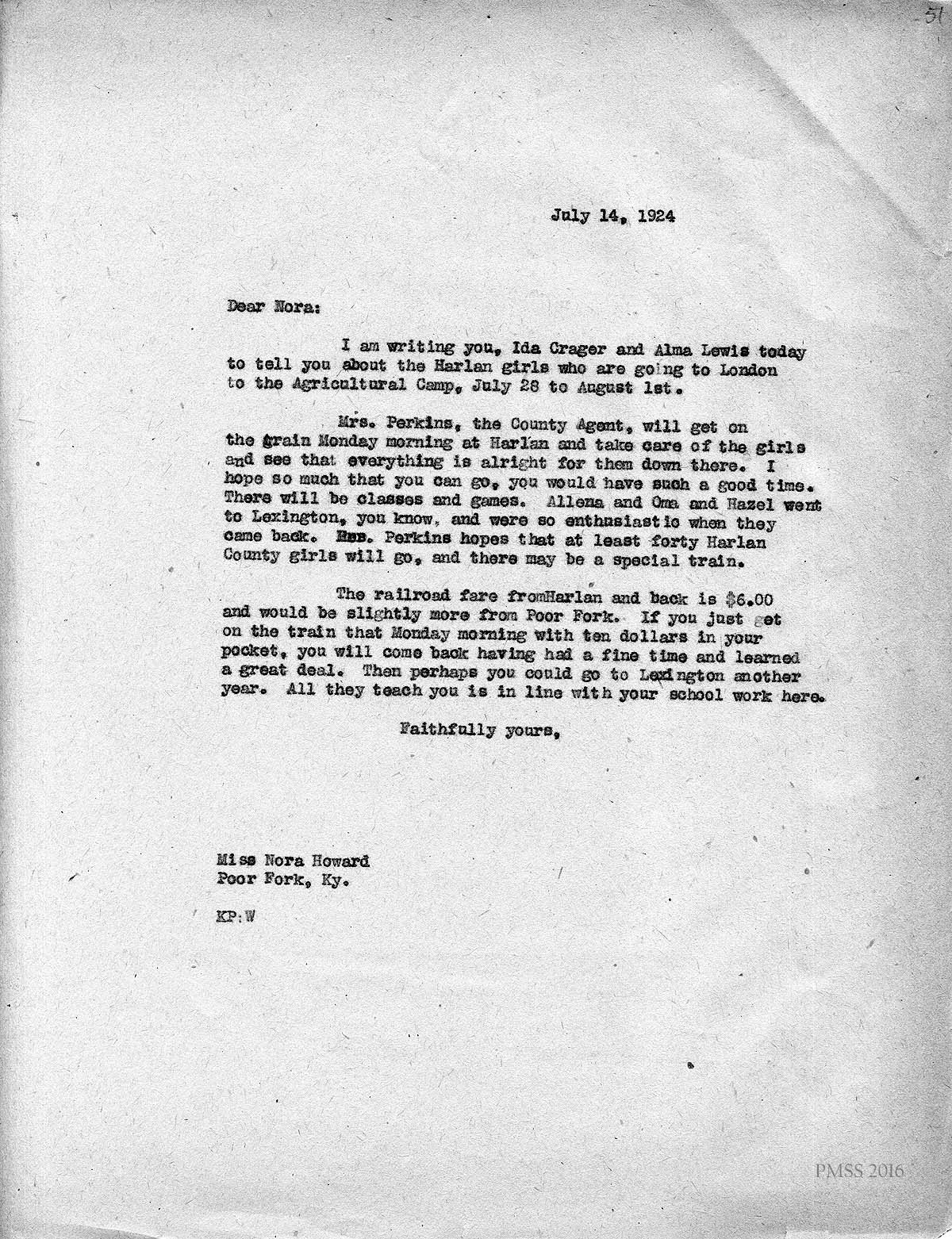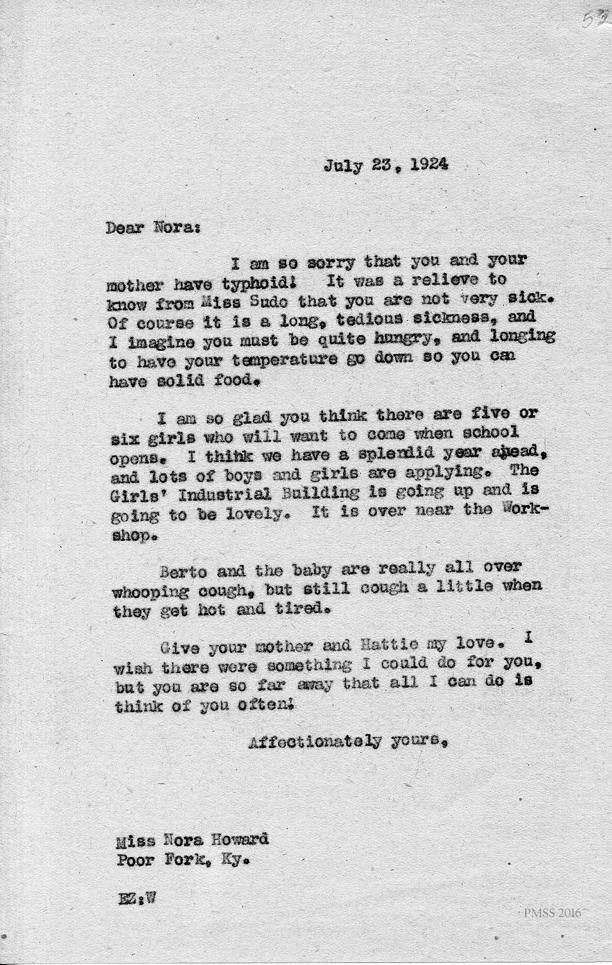 Nora first attended Pine Mountain Settlement School in 1921 as a fifth-grader [age 15] and apparently completed grade school in 1923 at age 17. She then attended part of high school, leaving the School for Berea (KY) College in the Fall of 1927. By September 1927, Nora was writing from Berea College where she was working at Boone Tavern and going to school [?]. She was then 21 years old. Harriet remained at Pine Mountain, but by 1928 her sister Nora was working to enroll her at Berea.