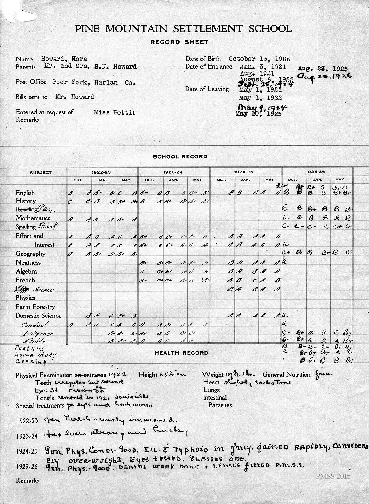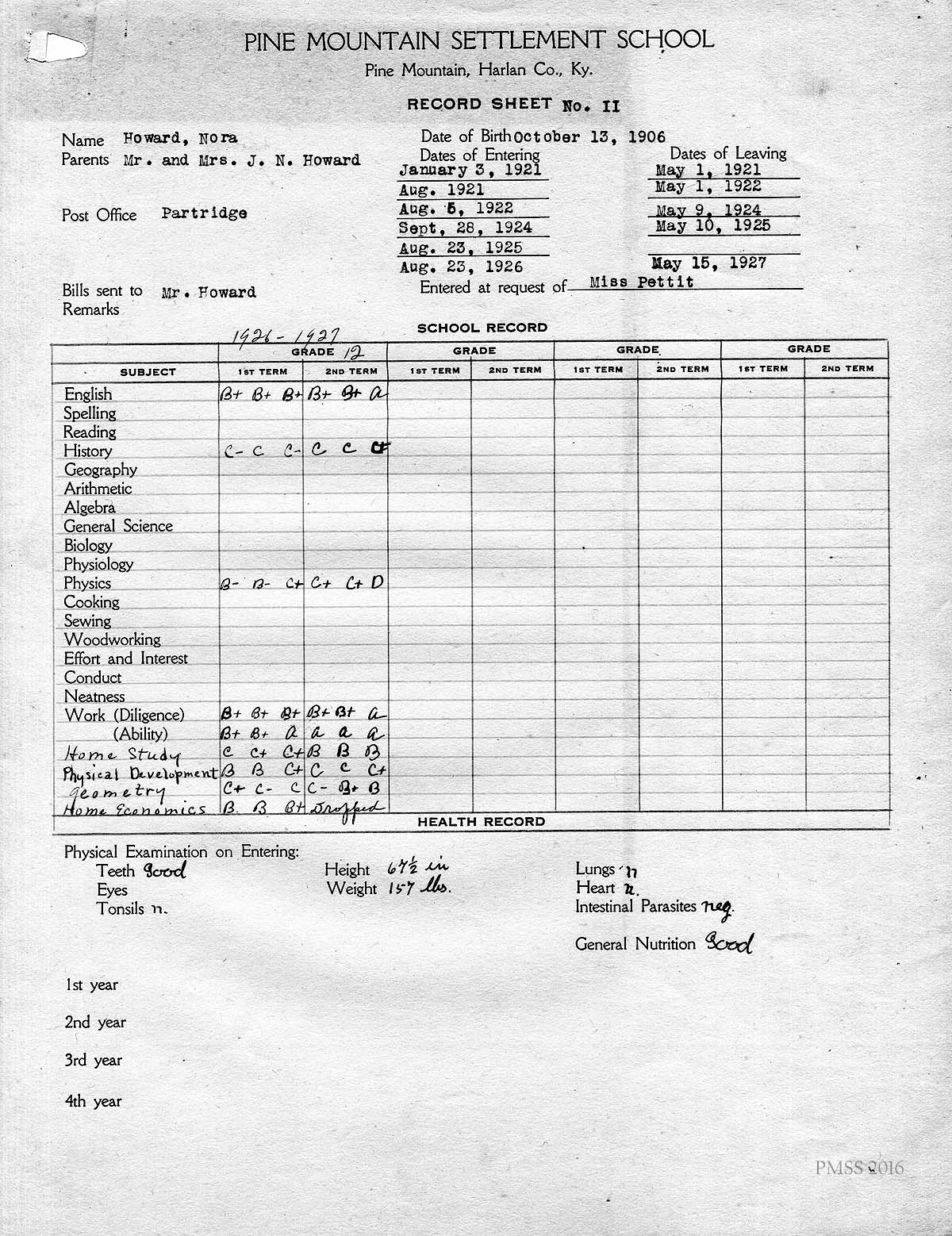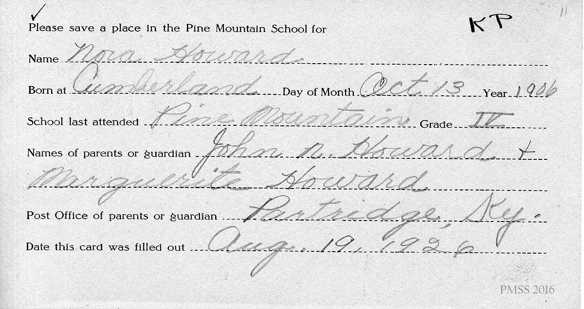 Source “Howard, Nora.” Student Records. Series 09: Biography. Pine Mountain Settlement School Institutional Papers. Pine Mountain Settlement School, Pine Mountain, KY. Archival material. |