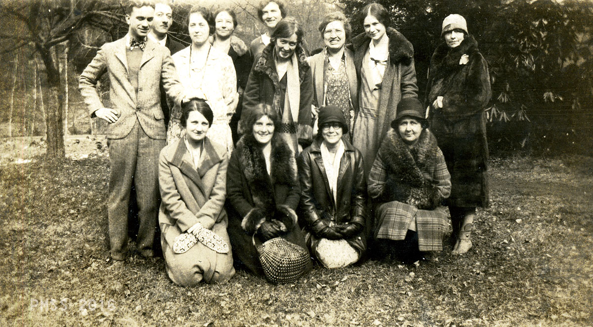 - (Standing) ?, Sam Winfrey, ?,?,?, Lexine Baird, RN, ?,?, ?; Seated: ?, Marian Kingman, Margaret Motter, Ethel de Long Zande (?). “Pine Mountain Settlement School, Ky. Teachers and Housemothers.”[neff_vennie_015]