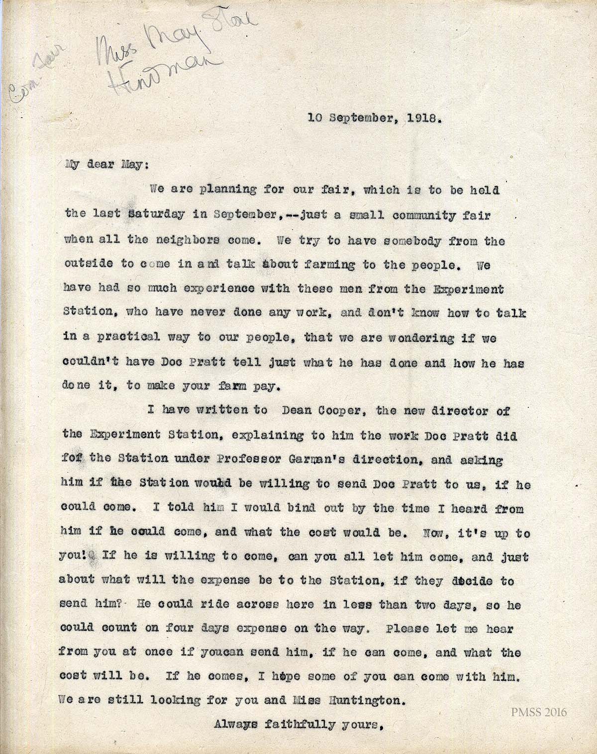 - September 10, 1918. Katherine Pettit to May Stone. Requests that Hindman share their farmer, Doc Pratt, to come to Pine Mountain for the September fair to talk to the community and if he would “tell just what he has done and how he has done it, to make your [Hindman’s] farm pay…” She advises Director Stone that she has written to Dean Cooper the new Director of the Agricultural Experiment Station for the University of Kentucky and “…explaining the work Doc Pratt did for the Station under Professor German’s direction,” and asking him if the Station would be willing to send Doc Pratt to us if he could come. She requests a report of expenses for sharing Pratt. She also invites May Stone to come to PMSS and bring along Miss Huntington [Ruth Huntington].