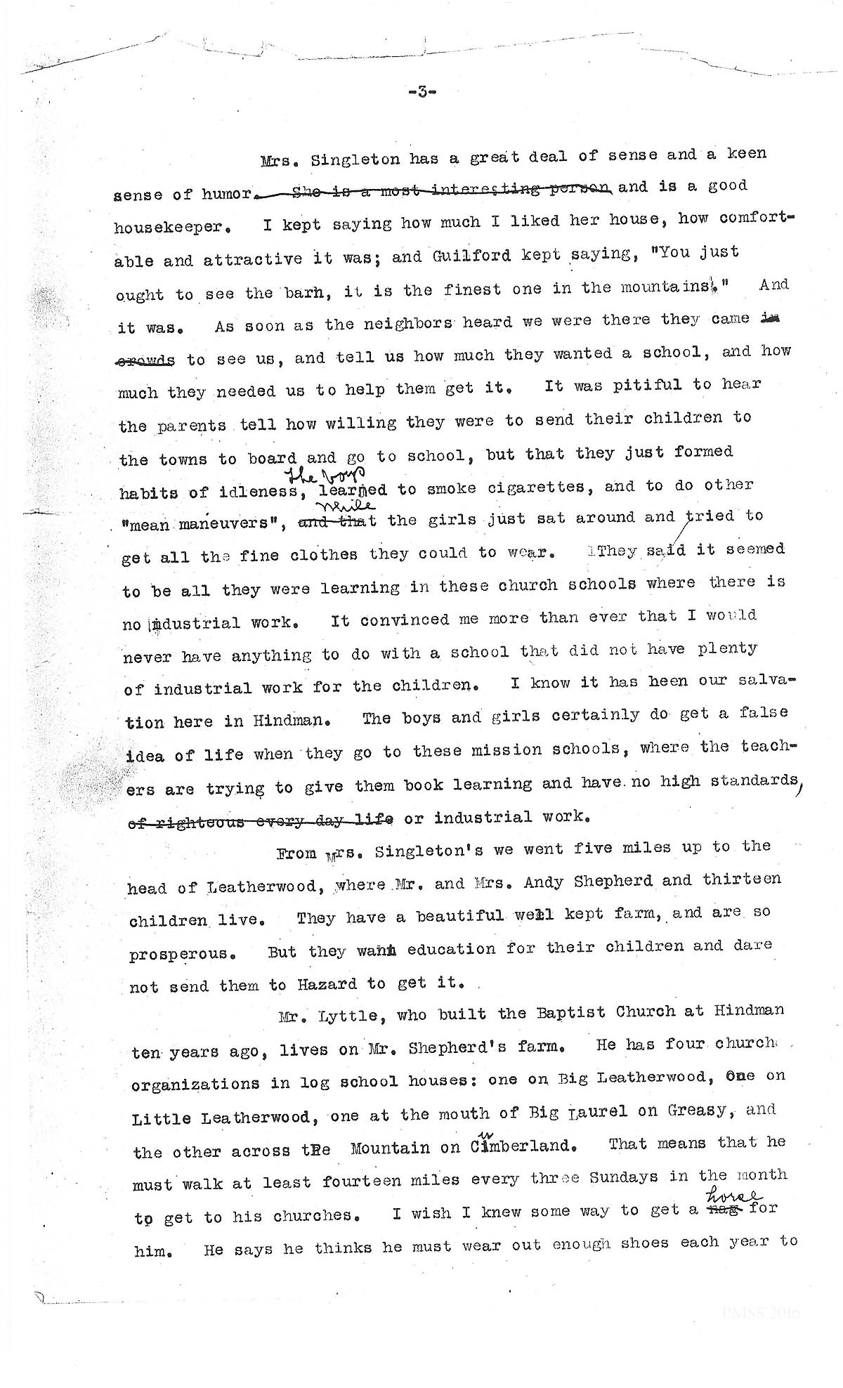 Mrs. Singleton has a great deal of sense and a keen sense of humor. [(strike through) She is a most interesting person] and is a good housekeeper. I kept saying how much I like her house, how comfortable and attractive it was; and Guilford kept saying, “You just ought to see the barn, it is the finest one in the mountains.” And it was. As soon as the neighbors heard we were there they came [in crowds] to see us and tell us how much they wanted a school, and how much they needed us to help them get it. It was pitiful to hear the parents tell how willing they were to send their children to the towns to board and go to school, but that they just formed habits of idleness. The boys learned to smoke cigarettes, and do other “mean maneuvers,” while the girls just sat around and tried to get all the fine clothes they could wear. They said it seemed to be all they were learning in these church schools where there is no industrial work. It convinced me more than ever that I would never have anything to do with a school that did not have plenty of industrial work for the children. I know it has been our salvation here in Hindman. The boys and girls certainly do get a false idea of life when they go to these mission schools, where the teachers are trying to give them book learning and have no high standards, [(strike-through) of righteous every day life] or industrial work.