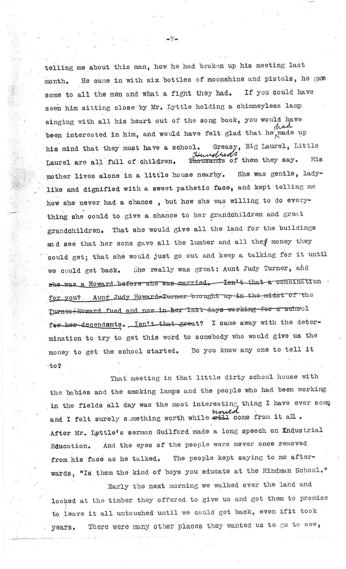 ...telling me about this man, how he had broken up his meeting last month. He came in with six bottles of moonshine and pistols, he gave some to all the men and what a fight they had. If you could have seen him sitting close by Mr. Lyttle holding a chimneyless lamp singing with all his heart out of the song book, you would have been interested in him and would have felt glad that he had made up his mind that they must have a school. Greasy, Big Laurel, Little Laurel are all full of children. Hundreds [(strike-through) thousands] of them they say. His mother lives alone in a little house nearby. She was gentle, lady-like and dignified with a sweet pathetic face, and kept telling me how she never had a chance, but how she was willing to do everything she could to give a chance to her grandchildren and great-grandchildren. That she would give all the land for the buildings and see that her sons gave all the lumber and all the money they could get; that she would just go out and keep a-talking for it until we could get back. She really was great; Aunt Judy Turner [(strike-through) and she was a Howard before she was married. Isn’t that a combination for you? Aunt Judy Howard-Turner brought up in the midst of the Turner-Howard feud and now in her last days working for a school for her descendants. Isn’t that great?] I came away with the determination to try to get this word to somebody who would give us the money to get the school started. Do you know any one to tell it to?